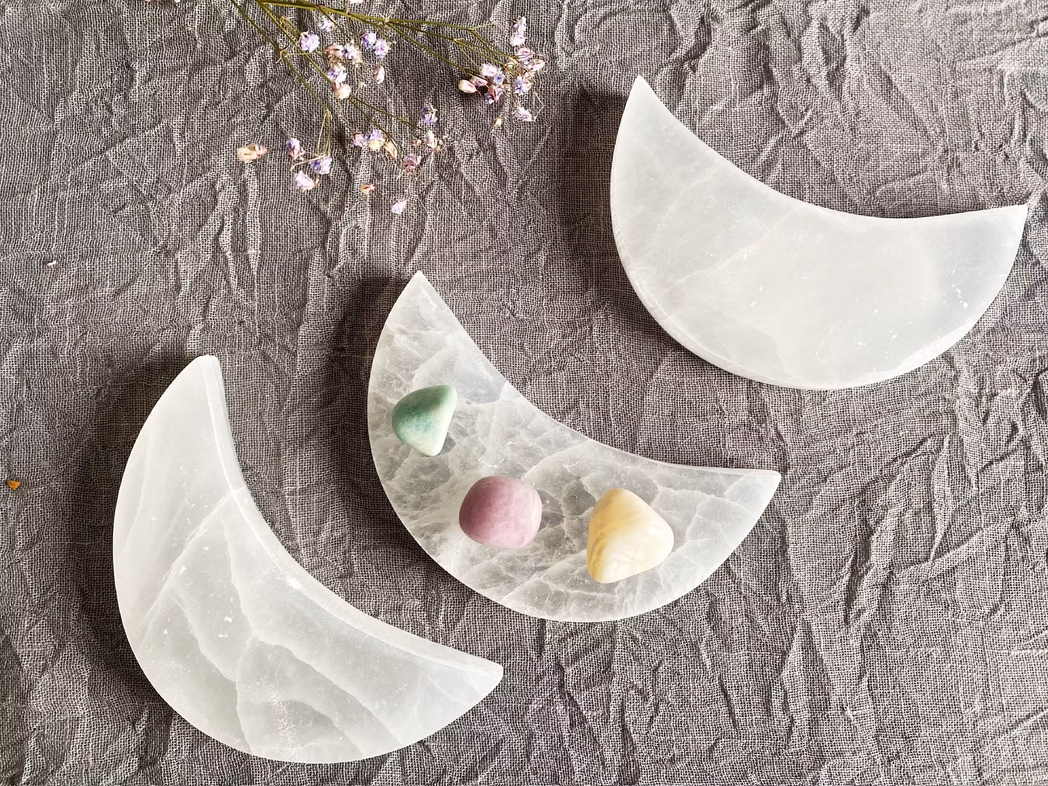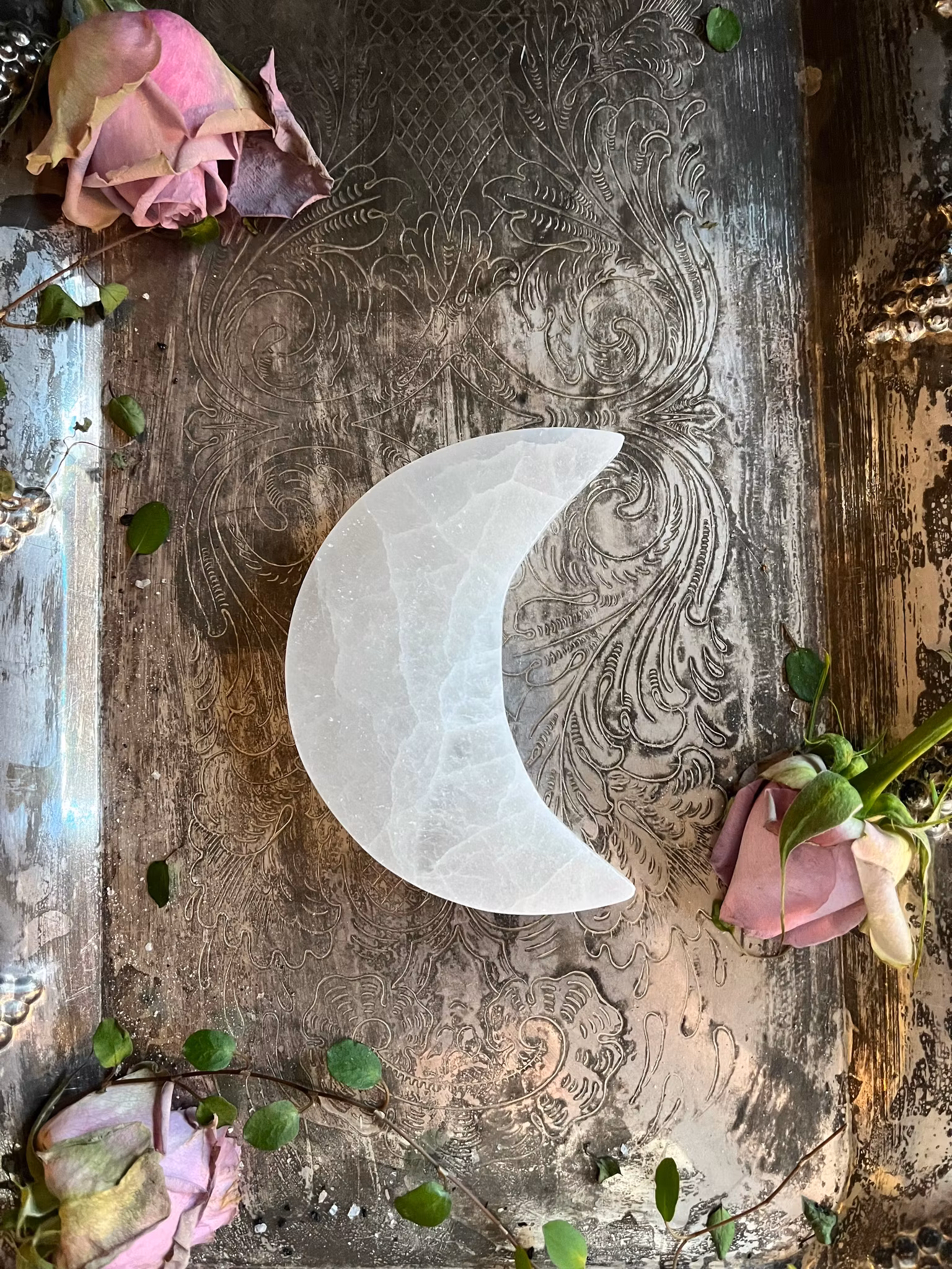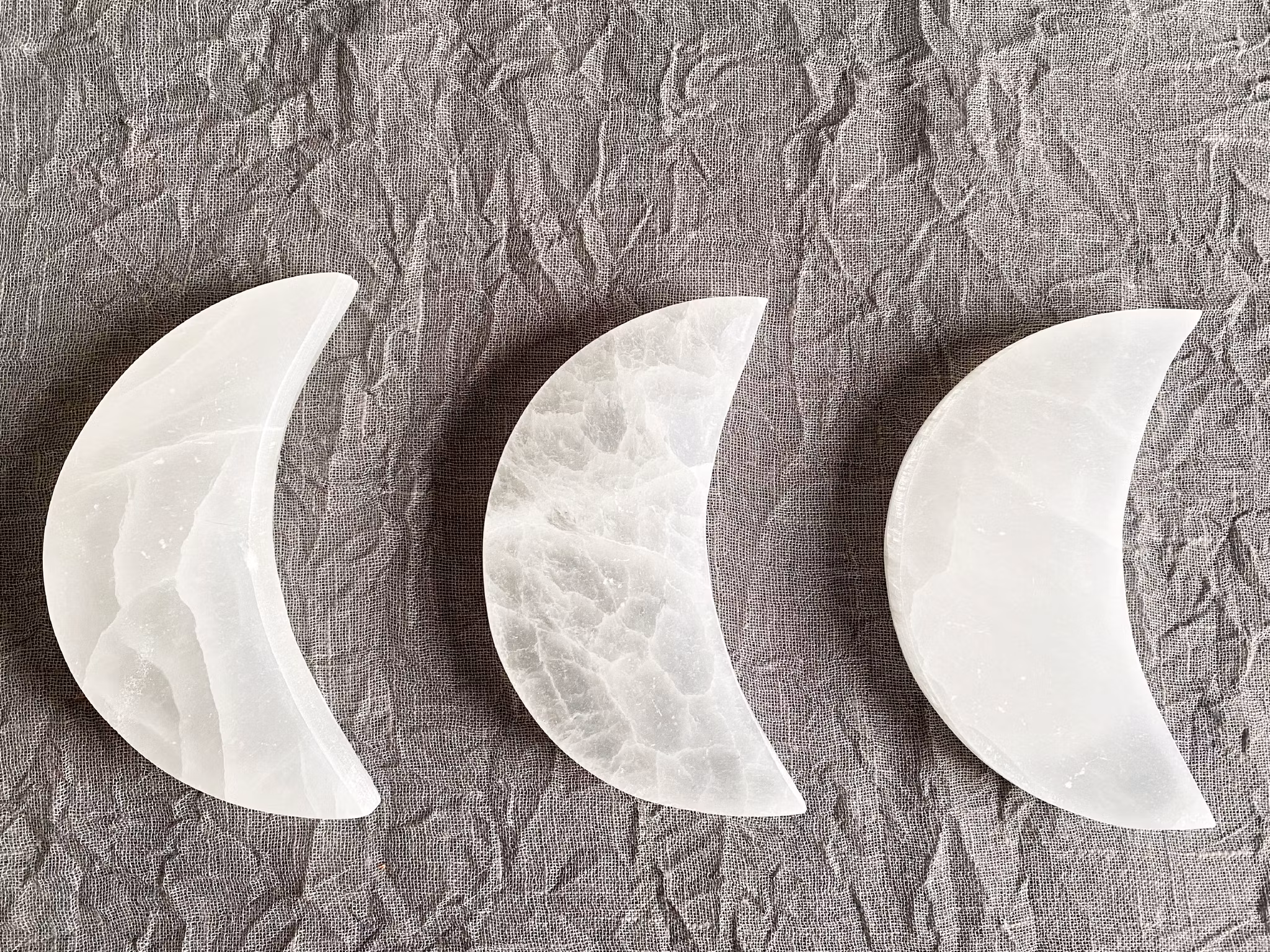 Mycket vacker selenitplatta formad som en måne. Mycket fina att ha t.ex. smycken på samt perfekt laddningsplatta för dina kristaller. De skiftar något i utseende. Vikt ca. 150-200 gram. Mått ca. 9,5x10,5 cm, tjocklek varierar. Du köper slumpvis liknande kristall enligt text & bild ovan. Tänk på att kristaller kommer från naturen & naturliga sprickor & ojämheter kan förekomma. Färger kan skilja sig beroende på hur ljuset faller ner på kristallen samt även mellan olika bildskärmar m.m.