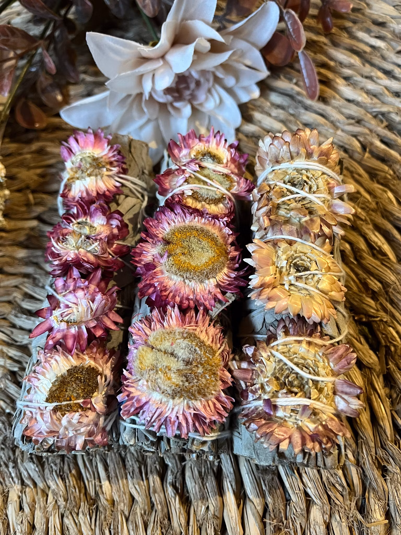 SEO/metabeskrivning: Handbunden vit salvia “Pink Sunflower” från Kalifornien. Premium smudgestick med ekologiska rosa solrosor – naturlig, pesticide-fri och fylld av solenergi. Perfekt för rening och ritual.