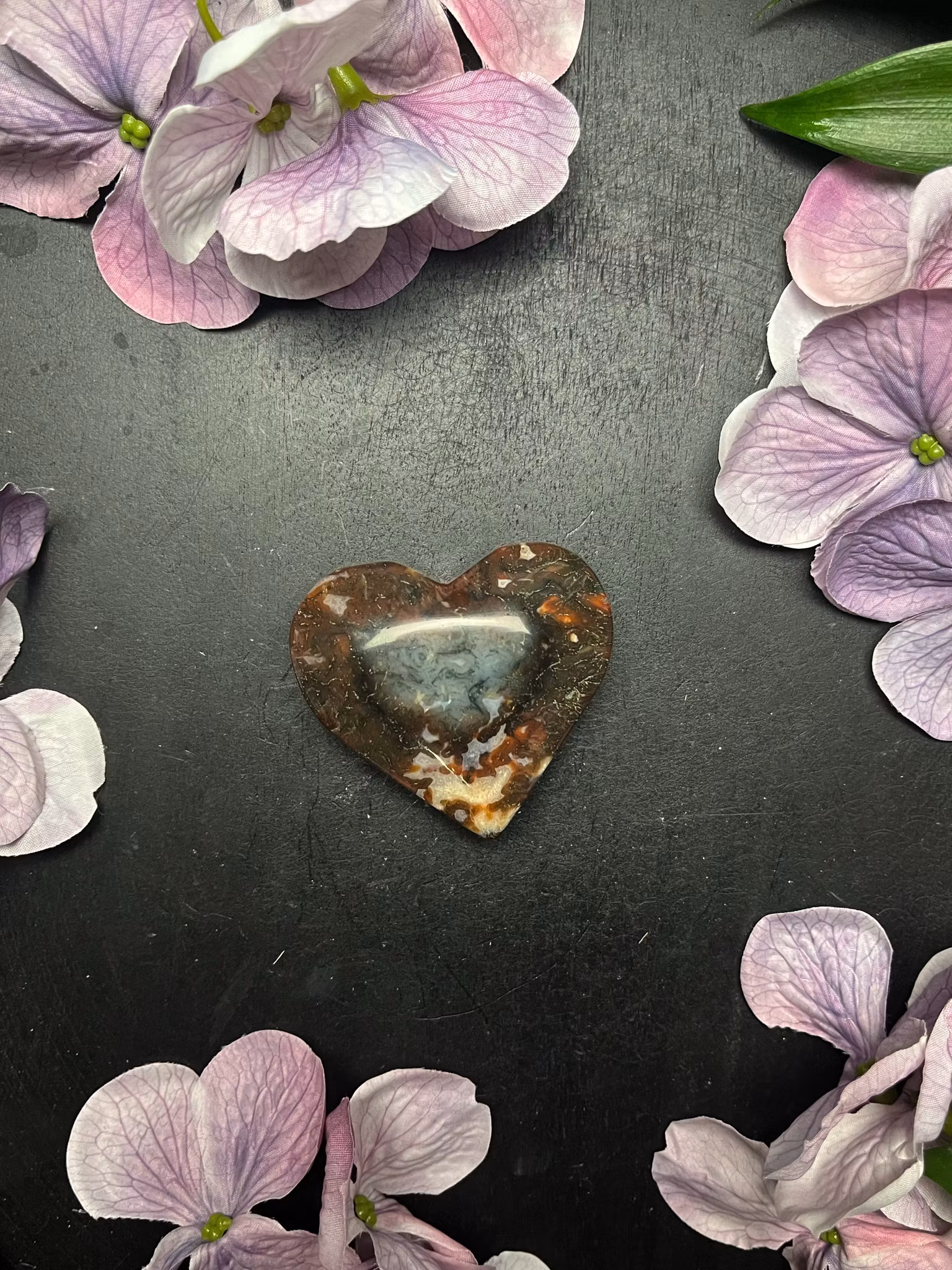 Otroligt fina polerade hjärtan i röd Moss Agat. Stenarna har unik naturliga mönster och färger, samt flera med fina kratrar i sig med gnistrande kristaller.