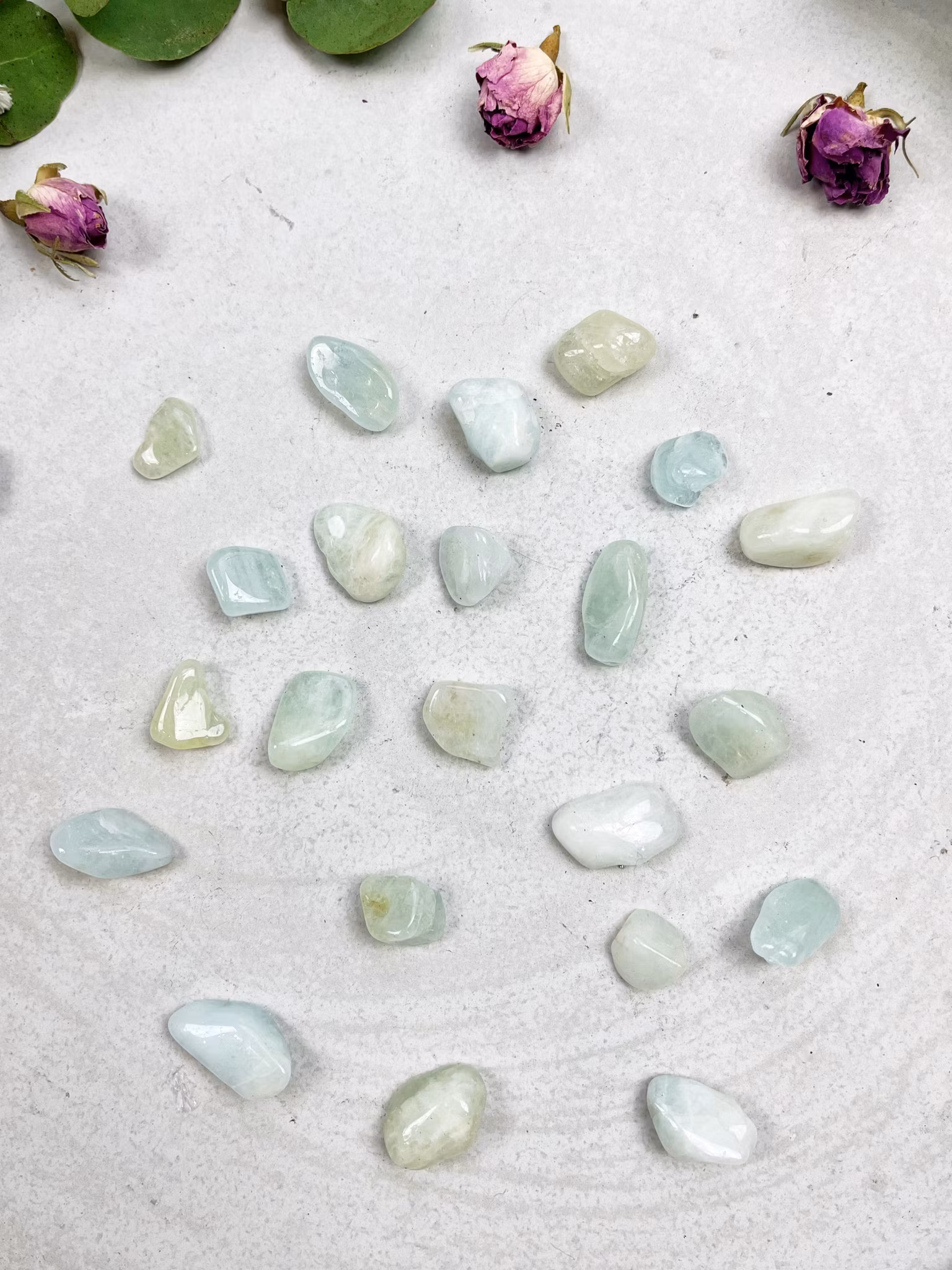 Akvamarin är en blå eller blågrön variant av beryll och finns främst i Brasilien, Madagaskar, Pakistan och Nigeria. Namnet betyder “havsvatten” och symboliserar havets lugn och klarhet.
