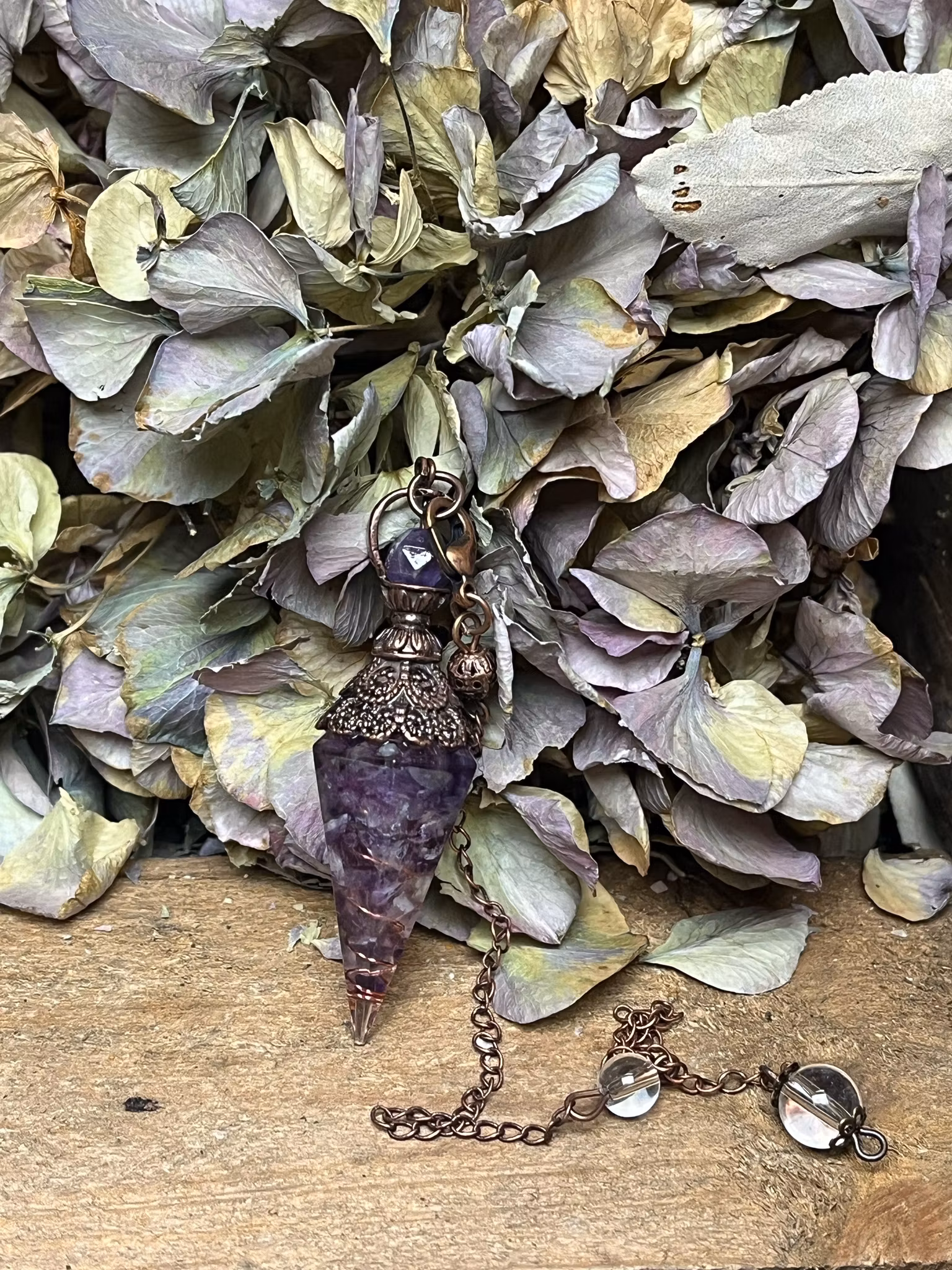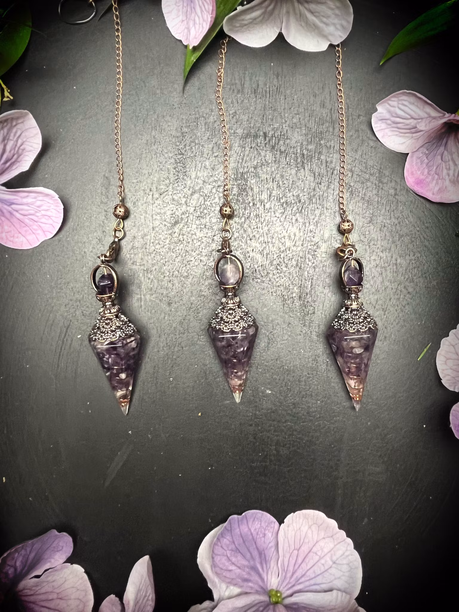 Vacker orgonit pendel rikt dekorerat med Bergkristall och Ametist.