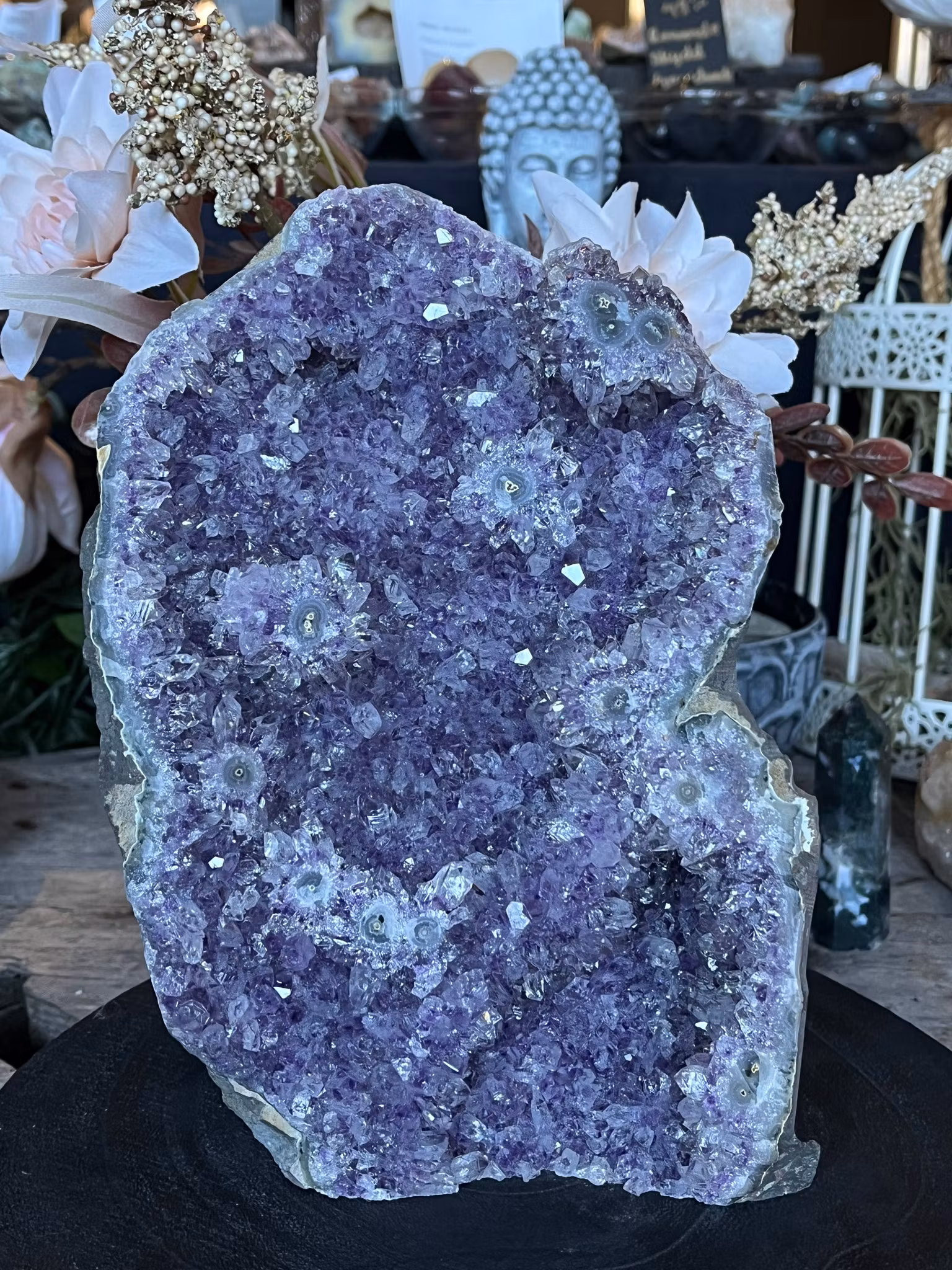Ametisten är stenen för lugn, intuition och andlig klarhet. Den hjälper till att stilla sinnet, lindra stress och främja inre balans. Traditionellt används den för att skydda mot negativ energi och stärka intuitionen vid meditation och drömarbete.