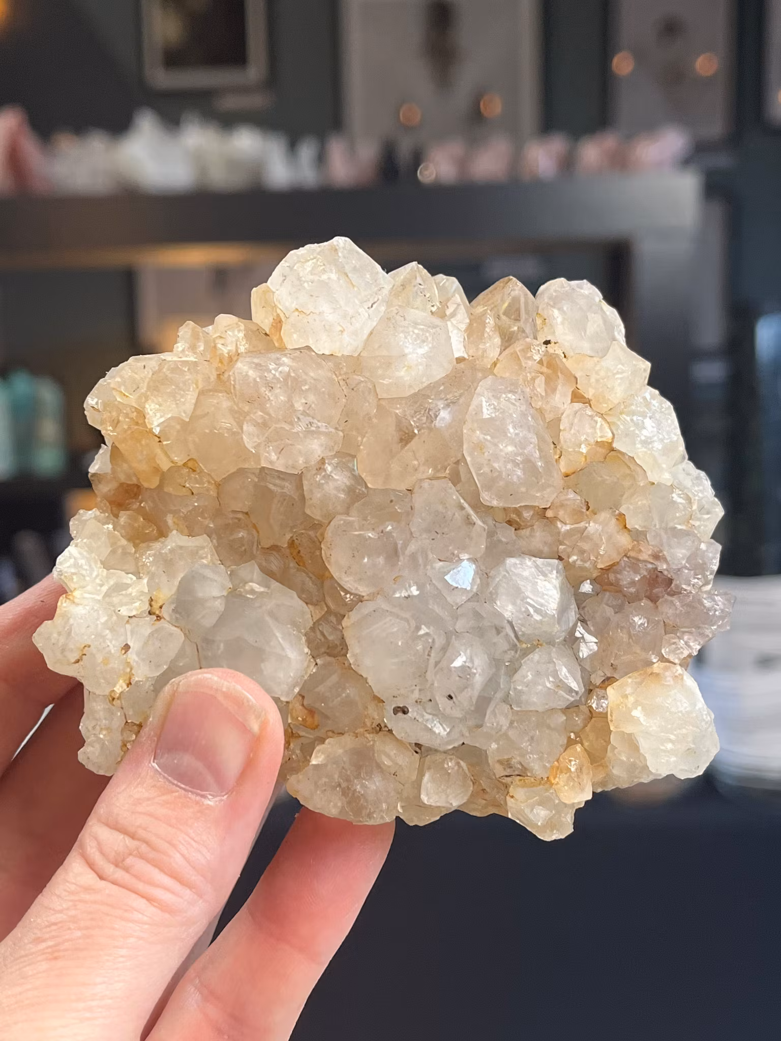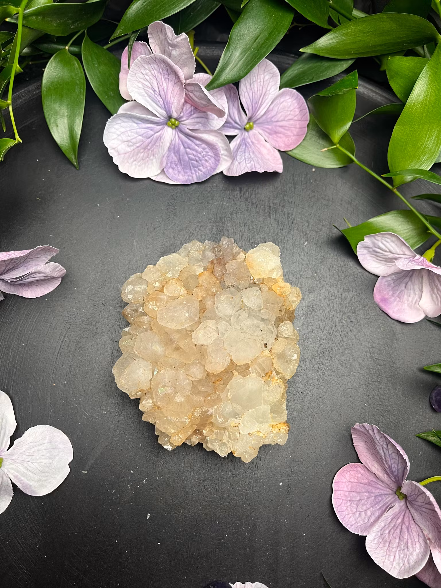 kluster i Anandalit. Kallas även för naturligt regnbågskluster då det finns inneslutningar av Rhodium som skapar regnbågsskiftande glimmer i bergkristallen.