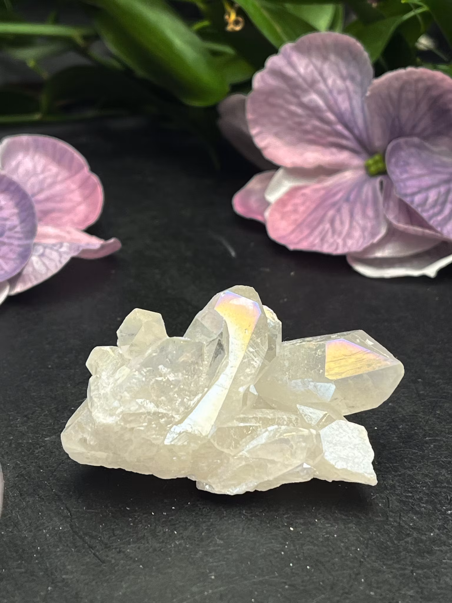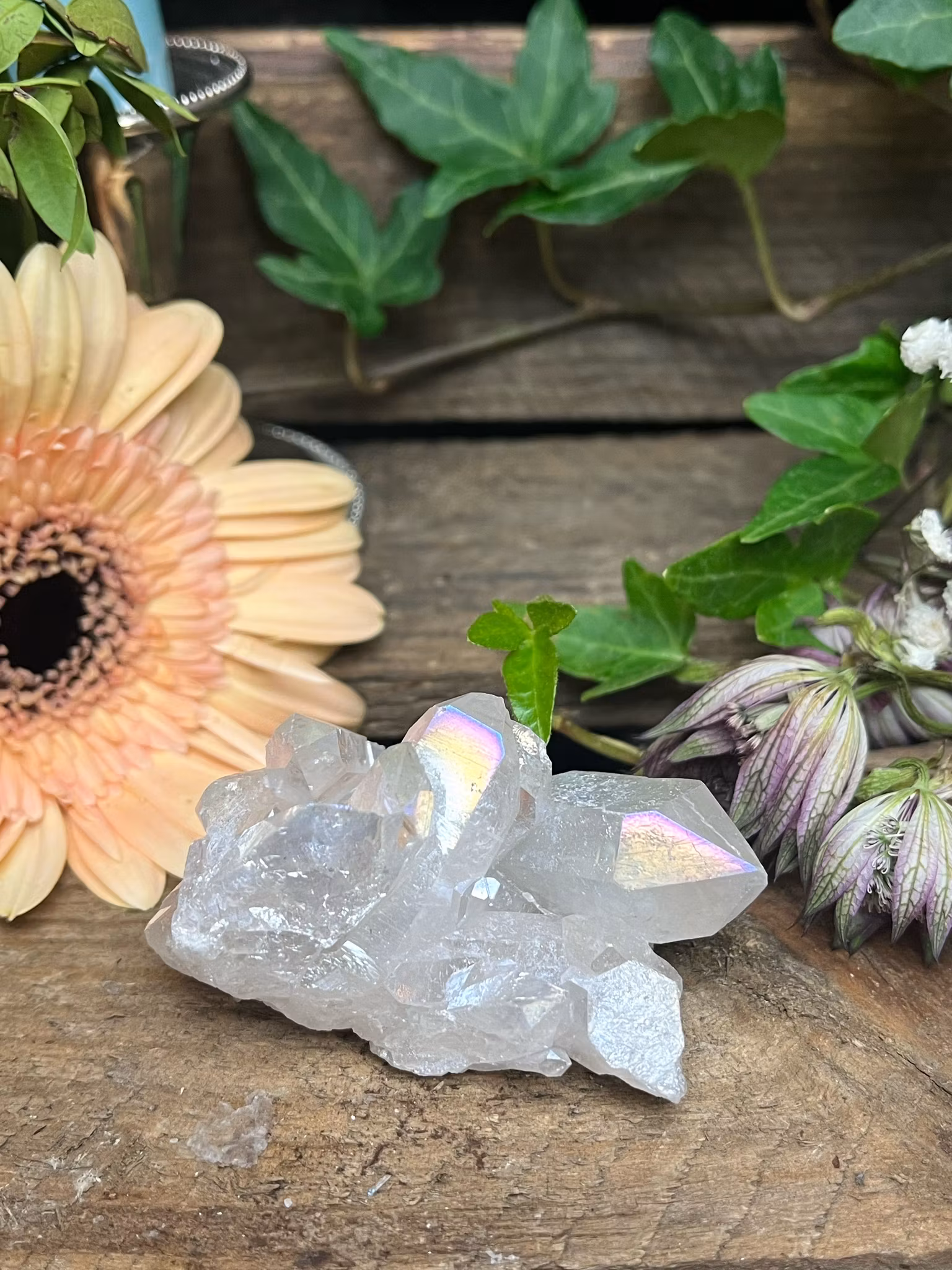 .Aura Angel kvarts har doppats i platina och bismuth och sedan behandlats i tryckkammare för att anta sin änglalika färg. Renande på auran och underlättar kontakten med dina änglar och guider. Tar bort negativitet och skyddar dig mot energitjuvar och energi attacker.