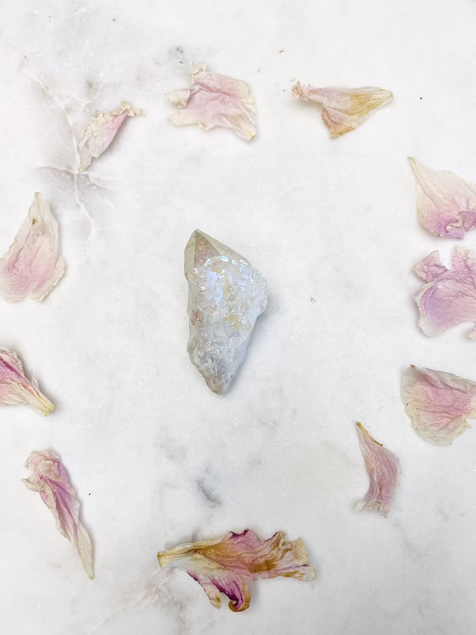 .Aura Angel kvarts har doppats i platina och bismuth och sedan behandlats i tryckkammare för att anta sin änglalika färg. Renande på auran och underlättar kontakten med dina änglar och guider. Tar bort negativitet och skyddar dig mot energitjuvar och energi attacker.