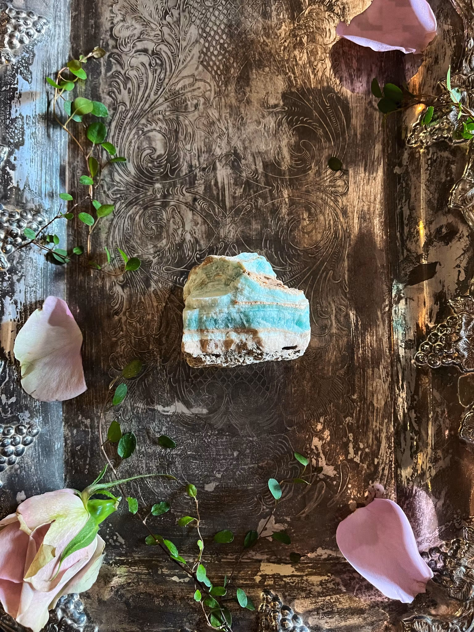 Karibisk blå Aragonit är en ganska ny sten som hittats i Pakistan, den är en blandning av olika Aragoniter. Den har en lugnande energi, som lättar sinnet och är mycket bra att använda vid tex. meditation. Hjälper dig att tänka i nya banor speciellt när du kört fast. Den tar bort negativa känslor och energier och omvandlar dem till positiv energi