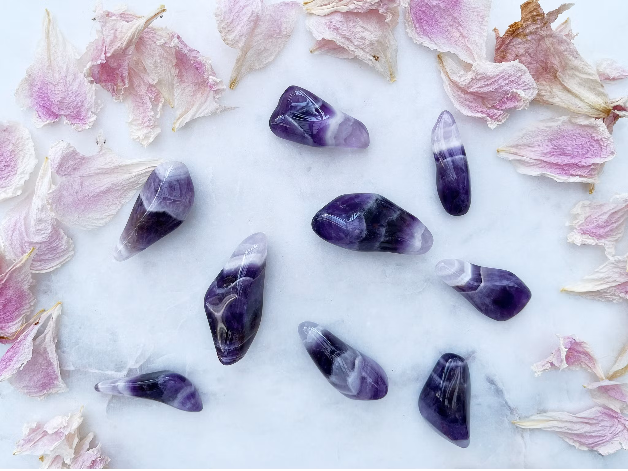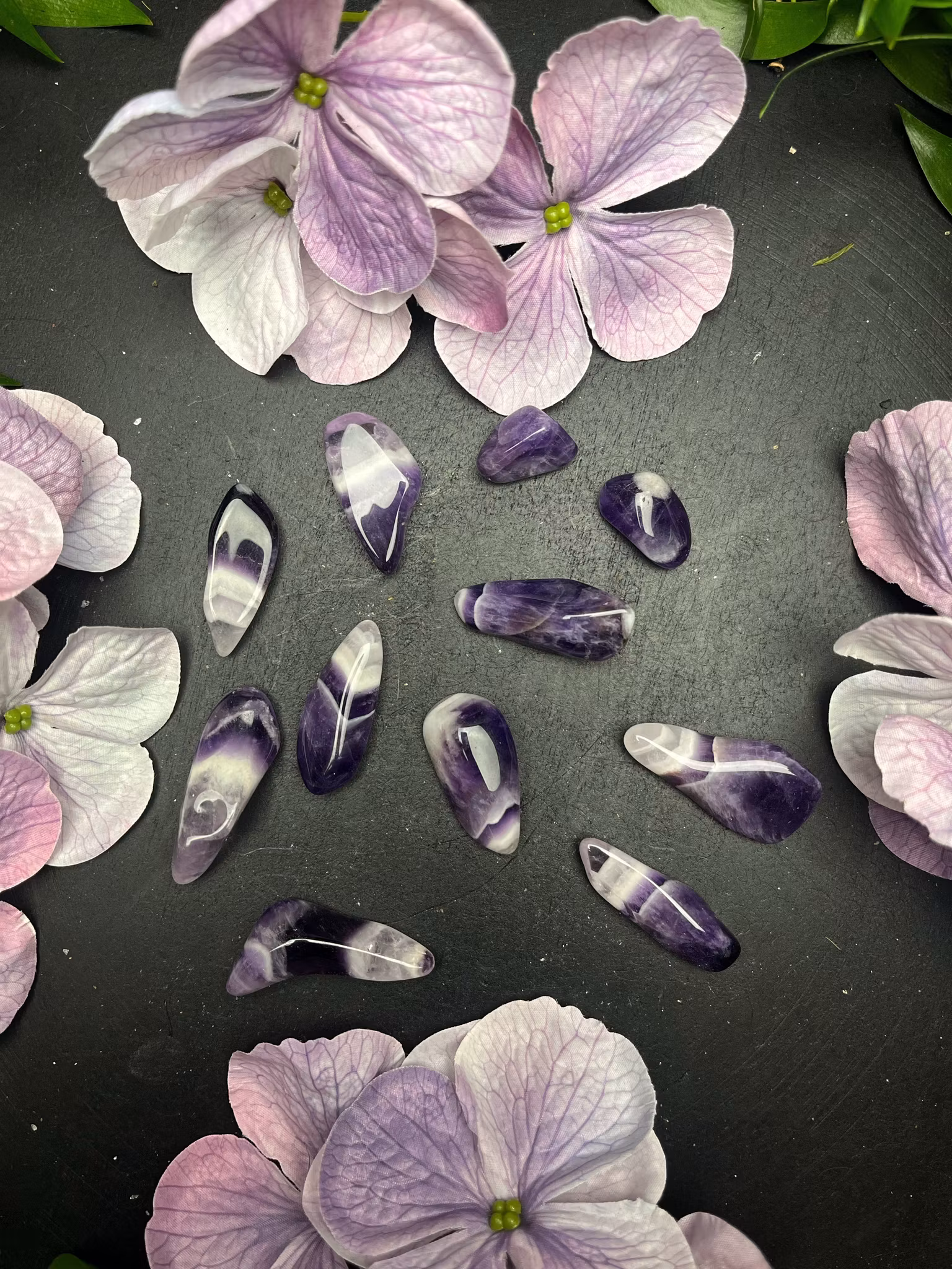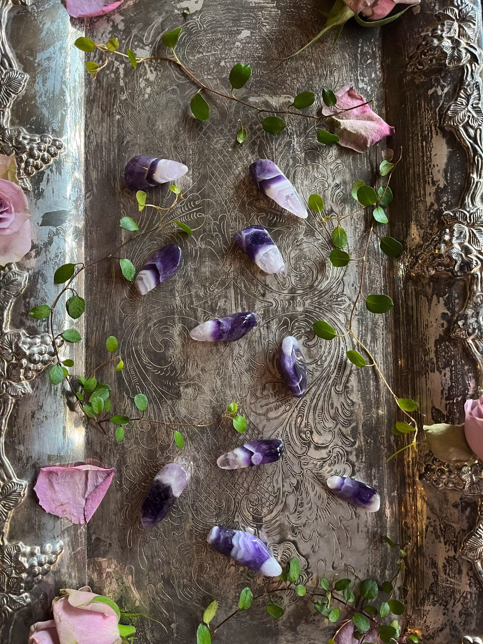Band Ametist är en blandning av Ametist och vit kvarts, blandade tillsammans. Den kallas även Chevron beroende på hur mönstret ser ut i stenen. Ger styrka, stressbefriande en mycket andlig sten.