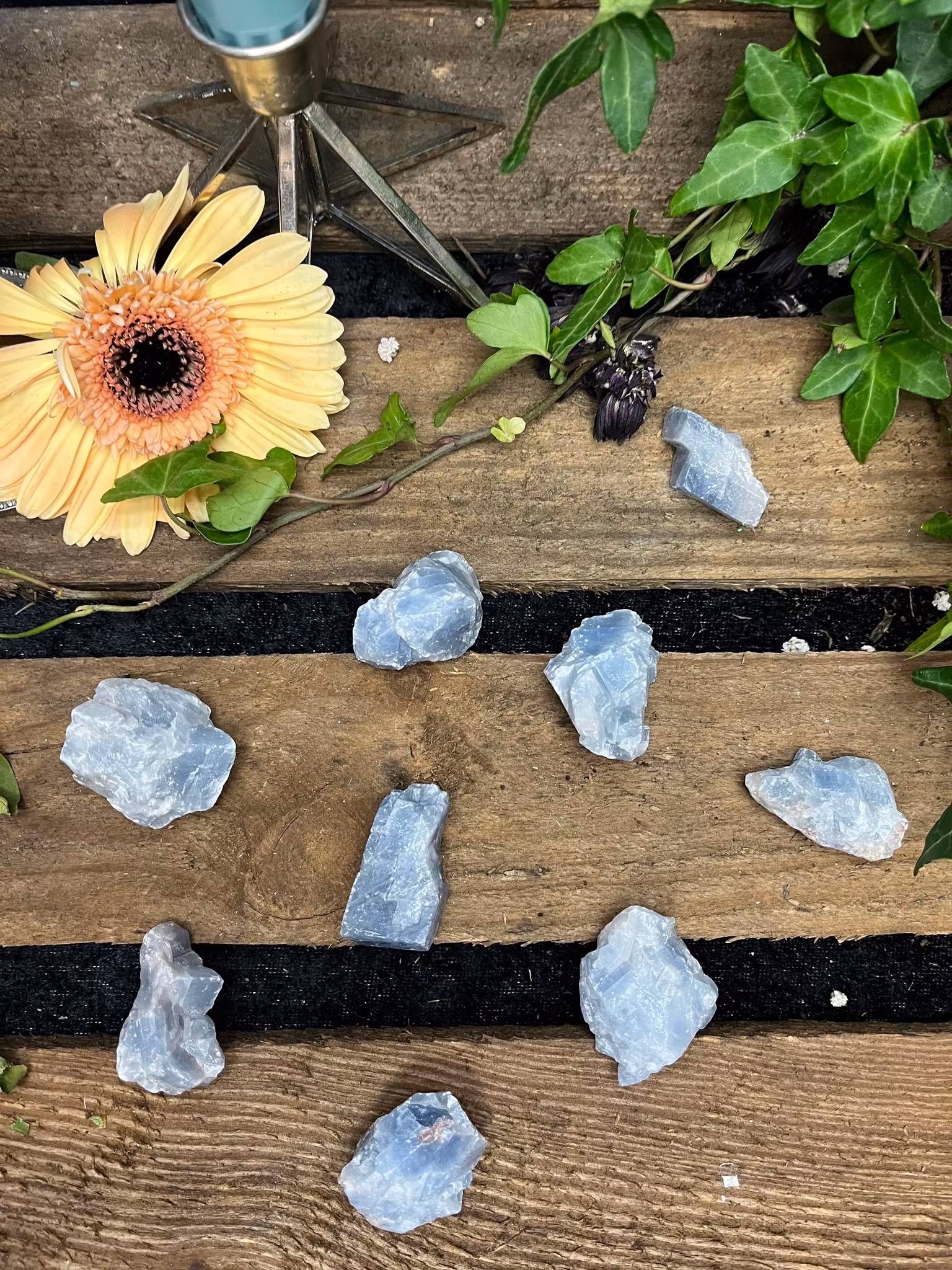 Blå kalcit har en mycket lugnande och rogivande energi, den lugnar de flesta nerver och nervösa personer. Den sänder ut lugn, och avkopplande energi. Mycket bra att använda vid trauman eller sorgearbete.