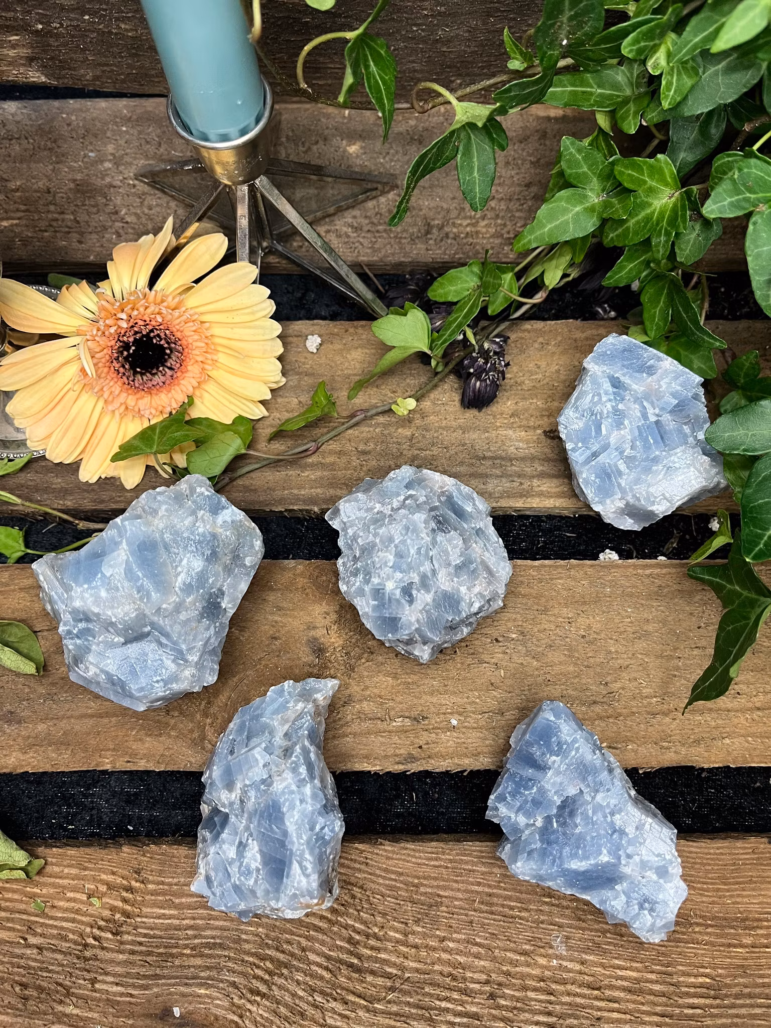 Blå kalcit har en mycket lugnande och rogivande energi, den lugnar de flesta nerver och nervösa personer. Den sänder ut lugn, och avkopplande energi. Mycket bra att använda vid trauman eller sorgearbete.