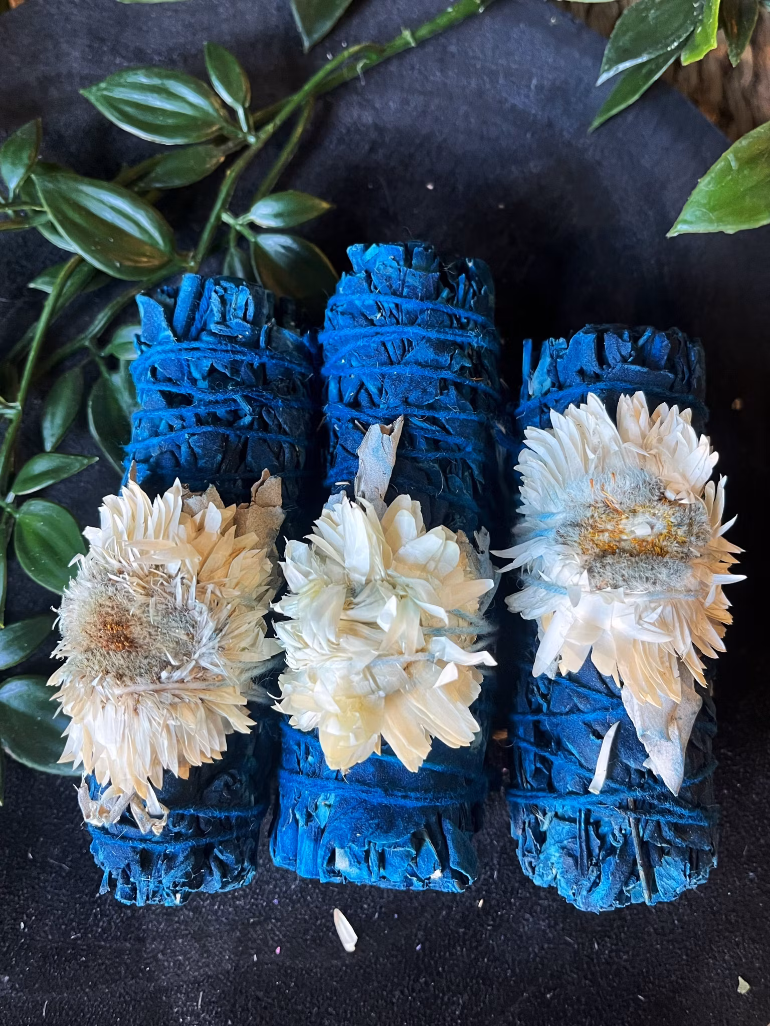 Magiska Blue Moon-salviabuntar â vackert blĂ„fĂ€rgade och dekorerade med ljusa blommor för en extra ceremoniell kĂ€nsla. Perfekta för rening, ritualer och stunder av stillhet.