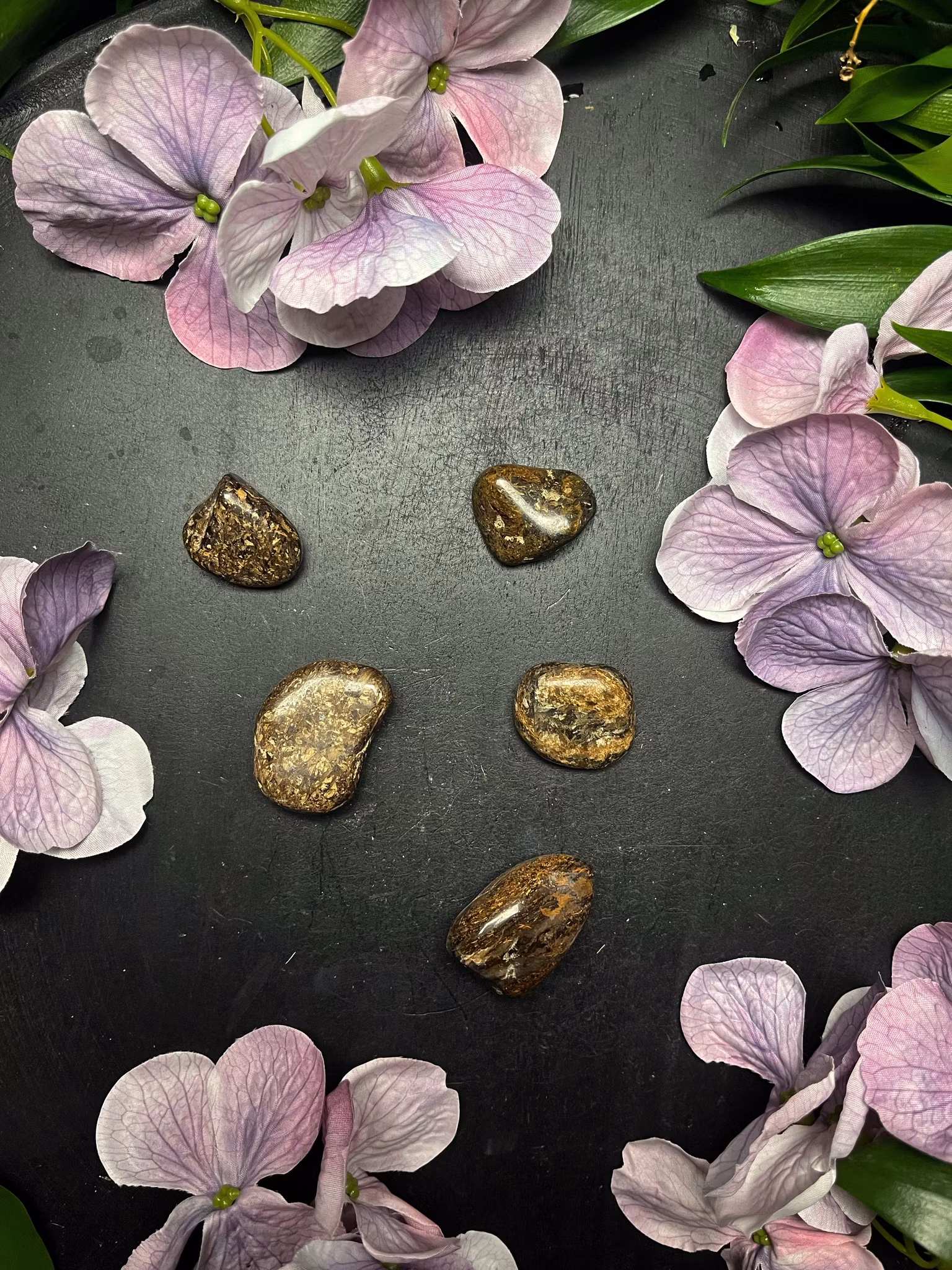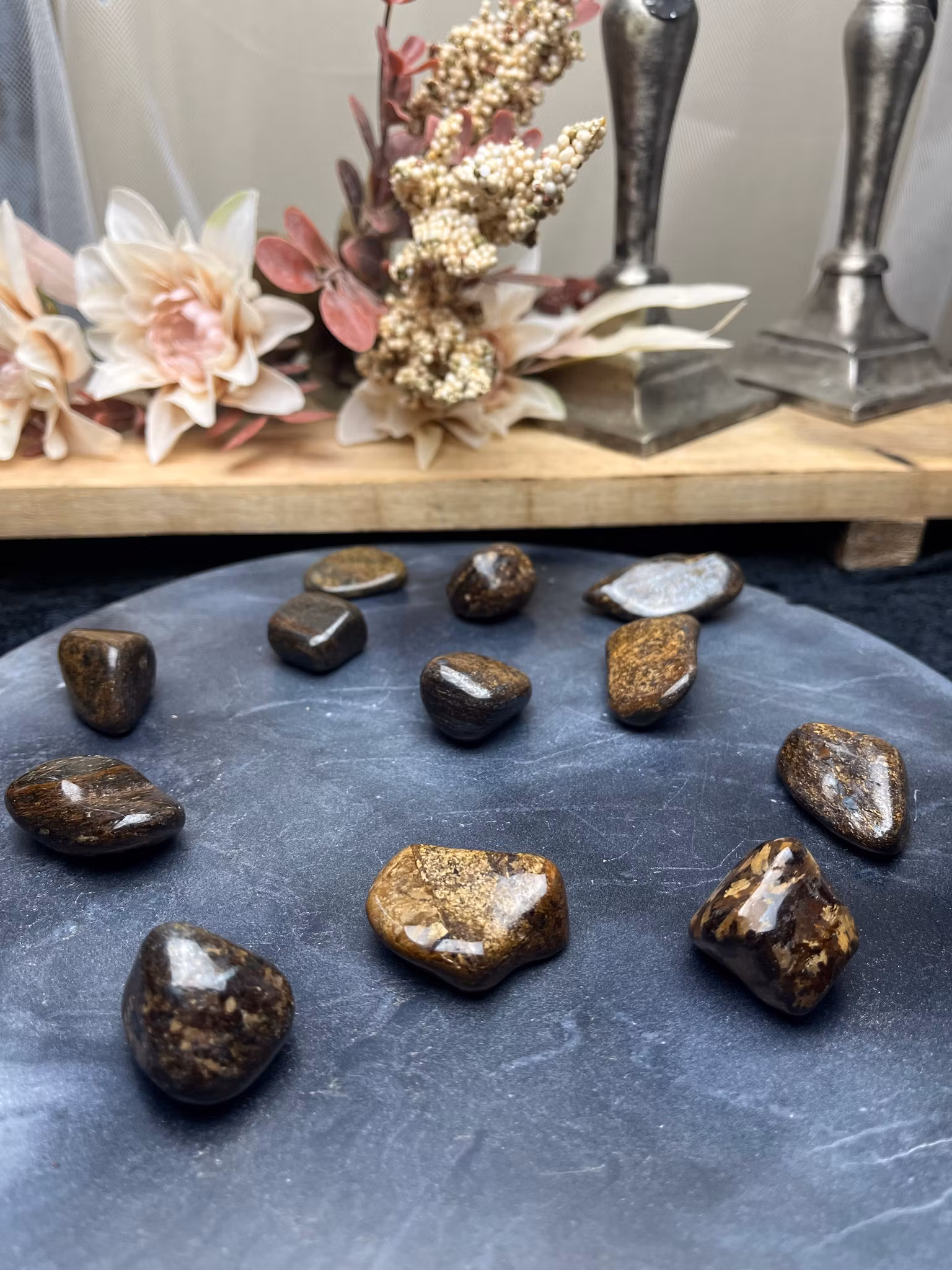 •Egenskaper: Bronsit är en kraftfull jordande och skyddande kristall som hjälper till att stabilisera känslor och stärka självkänslan. Den är känd för sin förmåga att reflektera negativa energier tillbaka till källan, vilket gör den till en utmärkt beskyddare. Bronsit främjar också beslutsamhet, självförtroende och ger styrka i utmanande situationer. Den är särskilt användbar för att minska stress och skapa en känsla av inre frid och balans.