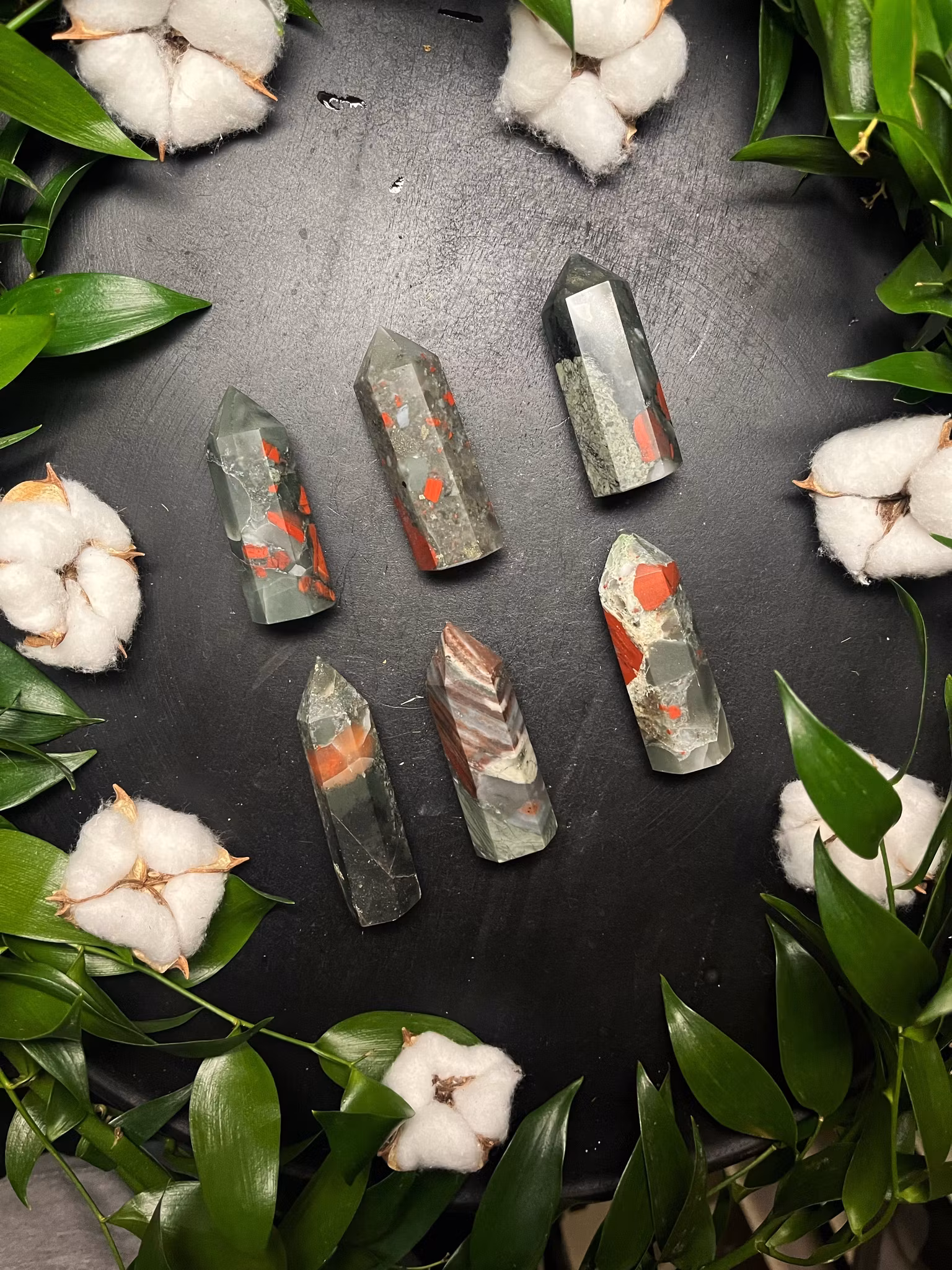 Heliotrop är en blodsten, den äkta, de röda prickarna som finns där är röd jaspis. Den är en kraftfull healing sten och har använts i tusentals år för dess healing krafter. Den används ofta för att avgifta och rena kroppen. Heliotrop för in kärlek och förståelse i alla situationer.