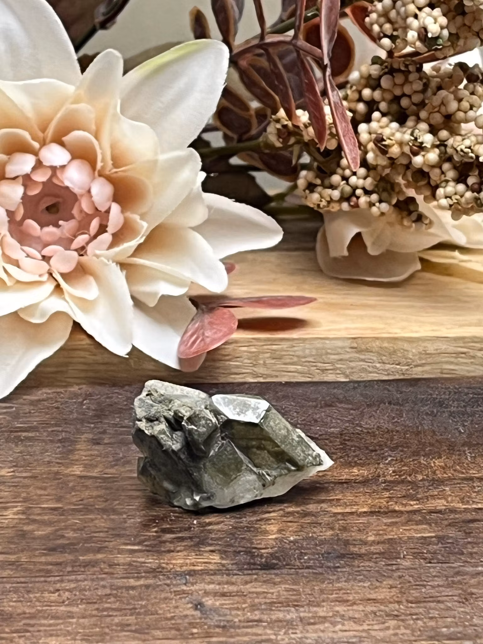 •Egenskaper: Kloritkvarts är en vacker kristall som kombinerar den klara energi från kvarts med den gröna, helande energin från kloriten. Den gröna färgen representerar främst läkning och tillväxt, och Kloritkvarts används ofta för att främja både fysisk och emotionell läkning. Den anses vara en av de mest kraftfulla kristallerna för att rensa och rena energifältet, både på individnivå och på omgivningens nivå. Kloritkvarts hjälper till att eliminera negativ energi och blockeringar, och kan bidra till att öka känsligheten för energier i sin omgivning. Den är också bra för att öppna upp hjärtchakrat och underlätta andlig medvetenhet. Kloritkvarts stärker livskraften och främjar självläkning, vilket gör den till en värdefull sten för alla som arbetar med energimedicin eller healing.