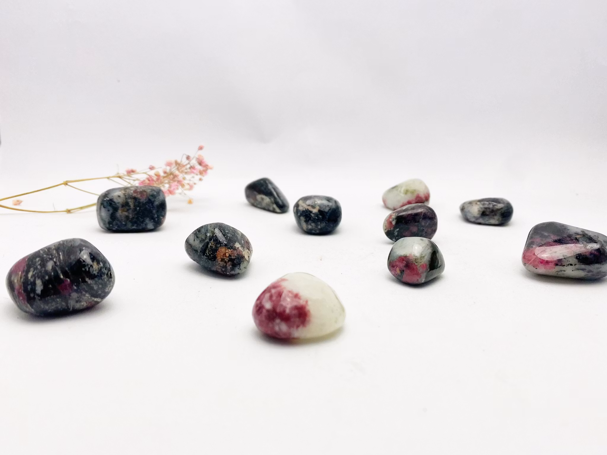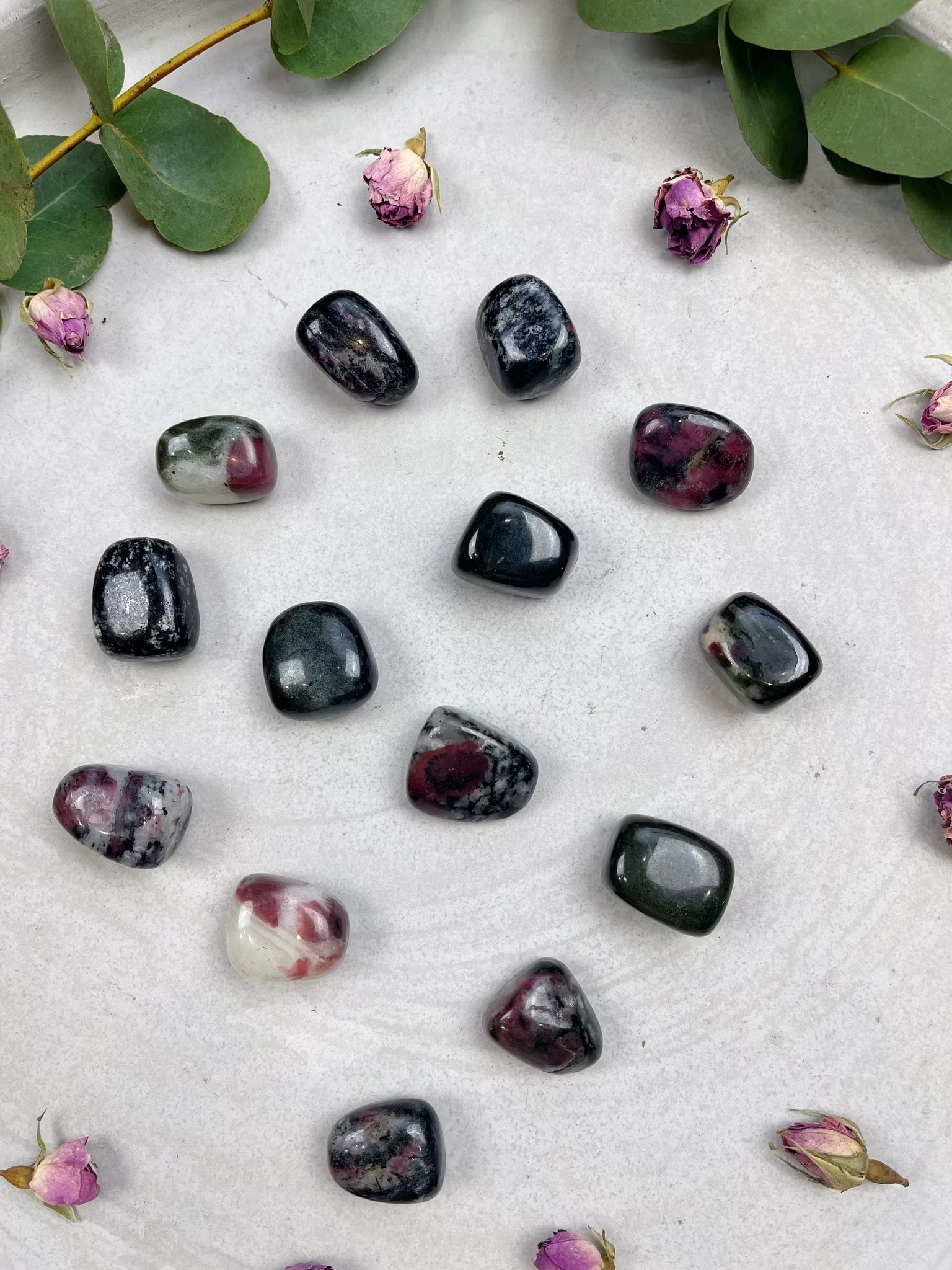 Eudialyt är en sällsynt kristall som främst hittas i Grönland, Kanada och Ryssland (Kolahalvön). Den har en vacker färgkombination av djup röd, rosa och svart.