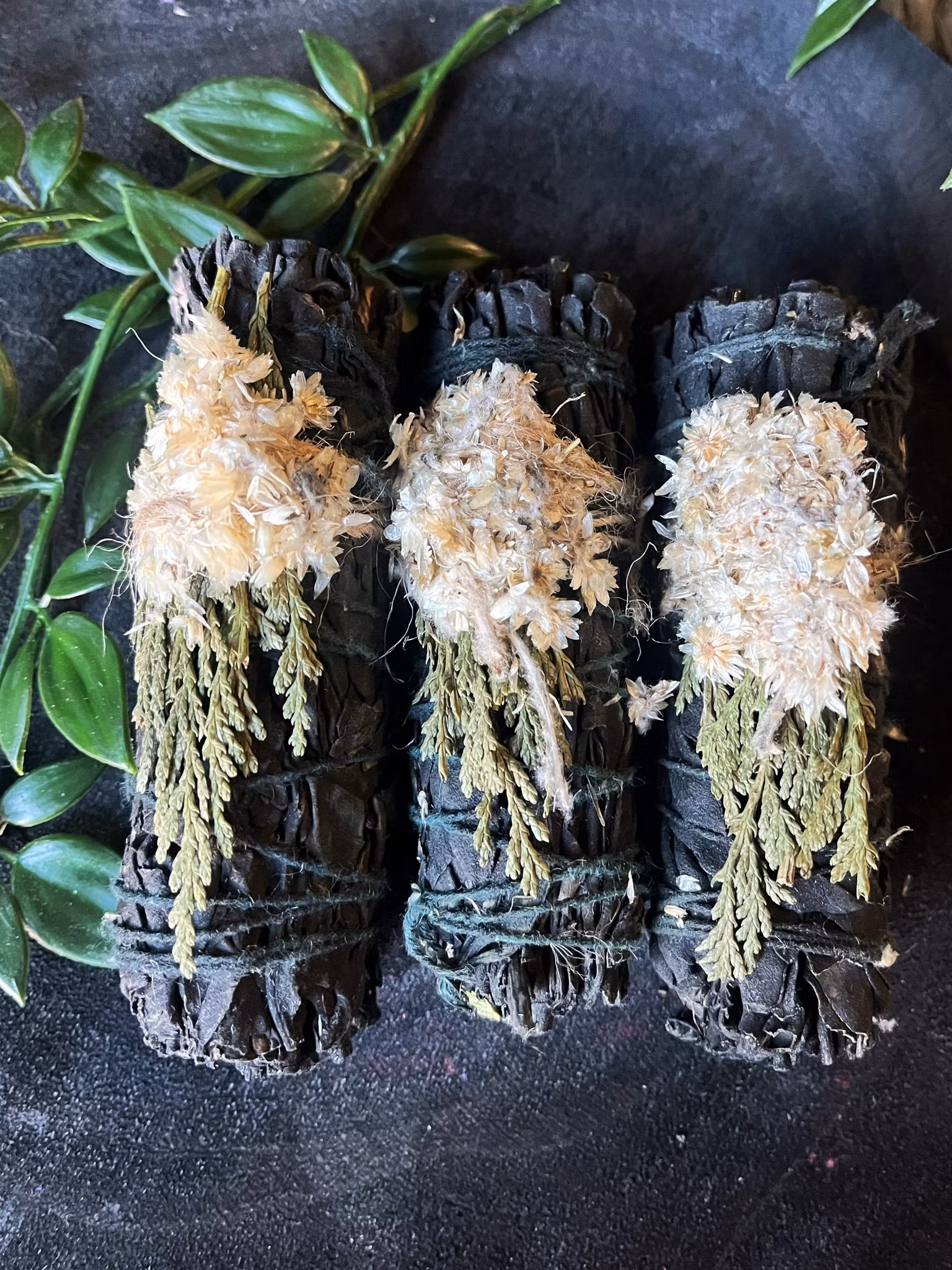 Mystiska Midnight Bloom-salviabuntar, svartfÀrgade och vackert dekorerade med blommor, cedertrÀ och mullein. En unik kombination som bjuder in kraft, djup och skyddande energi. Perfekta för rening, ritualer och kvÀllsceremonier.