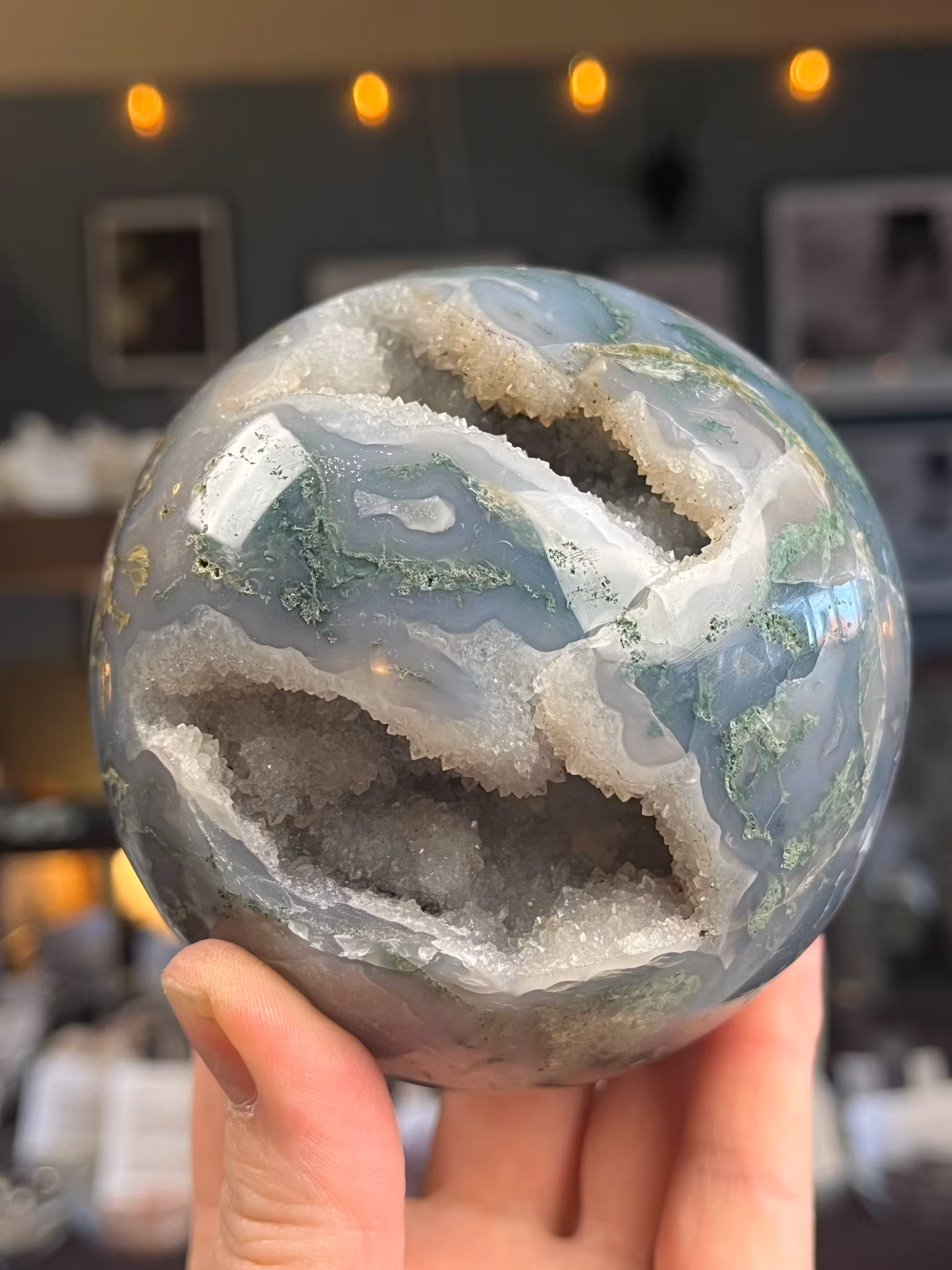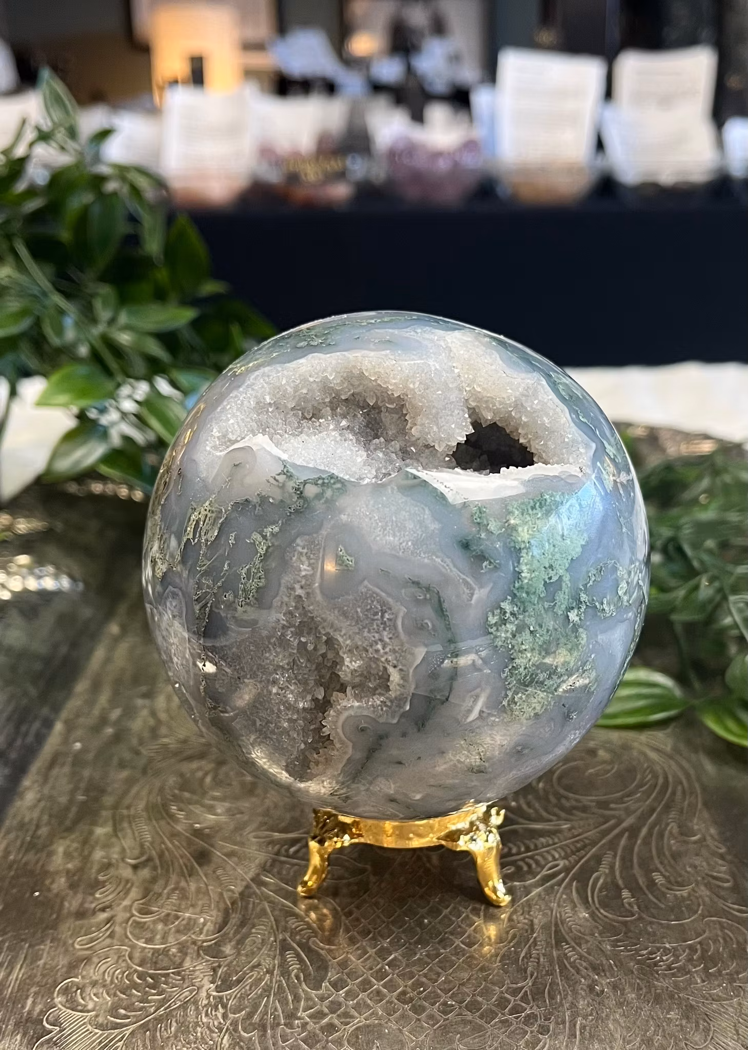 Moss Agat grundar, balanserar och stabiliserar. Ökar överflöd och stimulerar kreativiteten. En mycket andlig sten, lugnar sinnet och hjälper dig tänka klart.