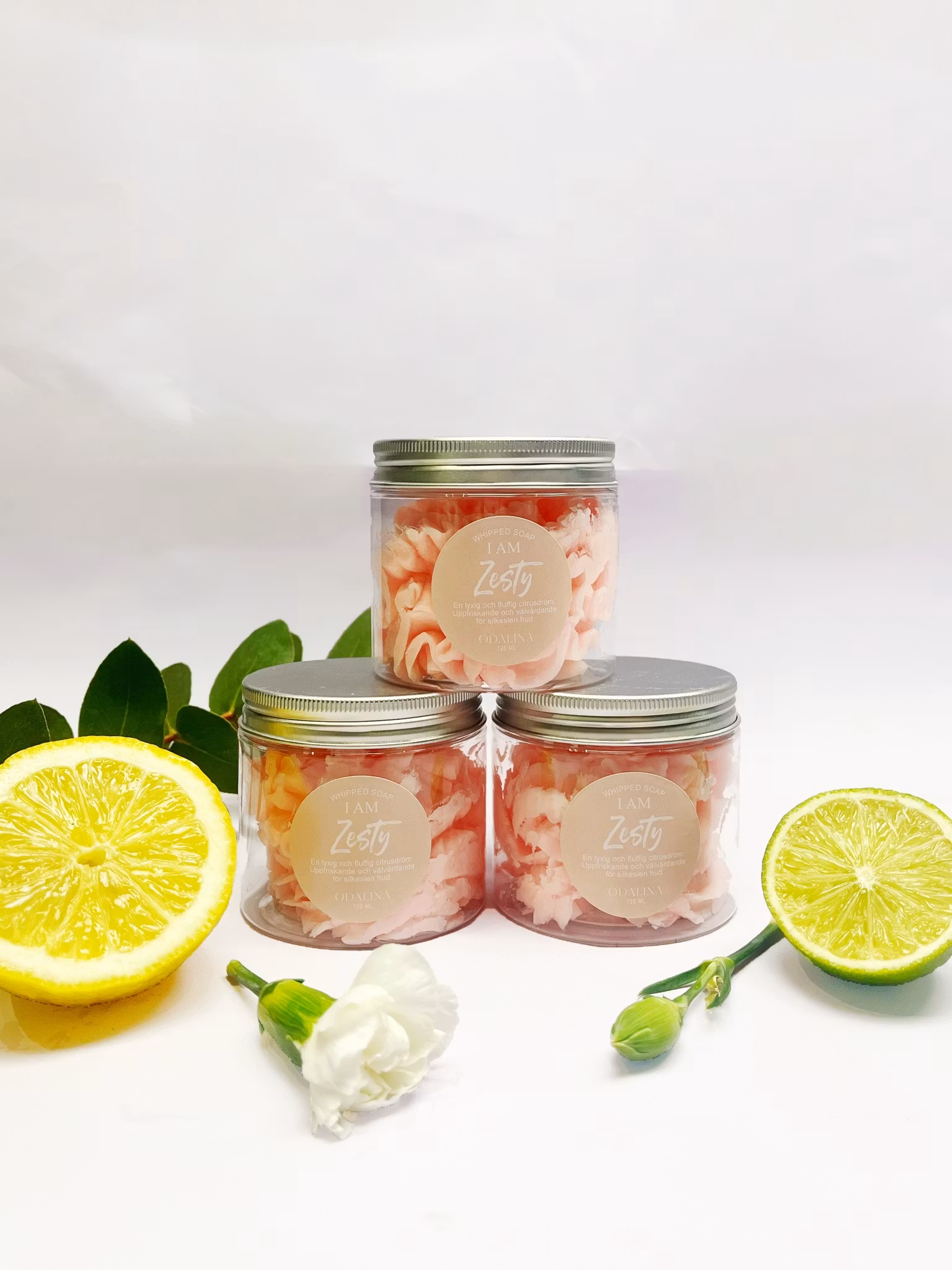 Starta dagen med I AM ZESTY, en luftig och fluffig vispad tvål som doftar uppfriskande av rosa lemonad. Med sin perfekta balans av syrligt citrus och fruktig sötma, ger denna tvål en energi- och humörhöjande duschupplevelse.