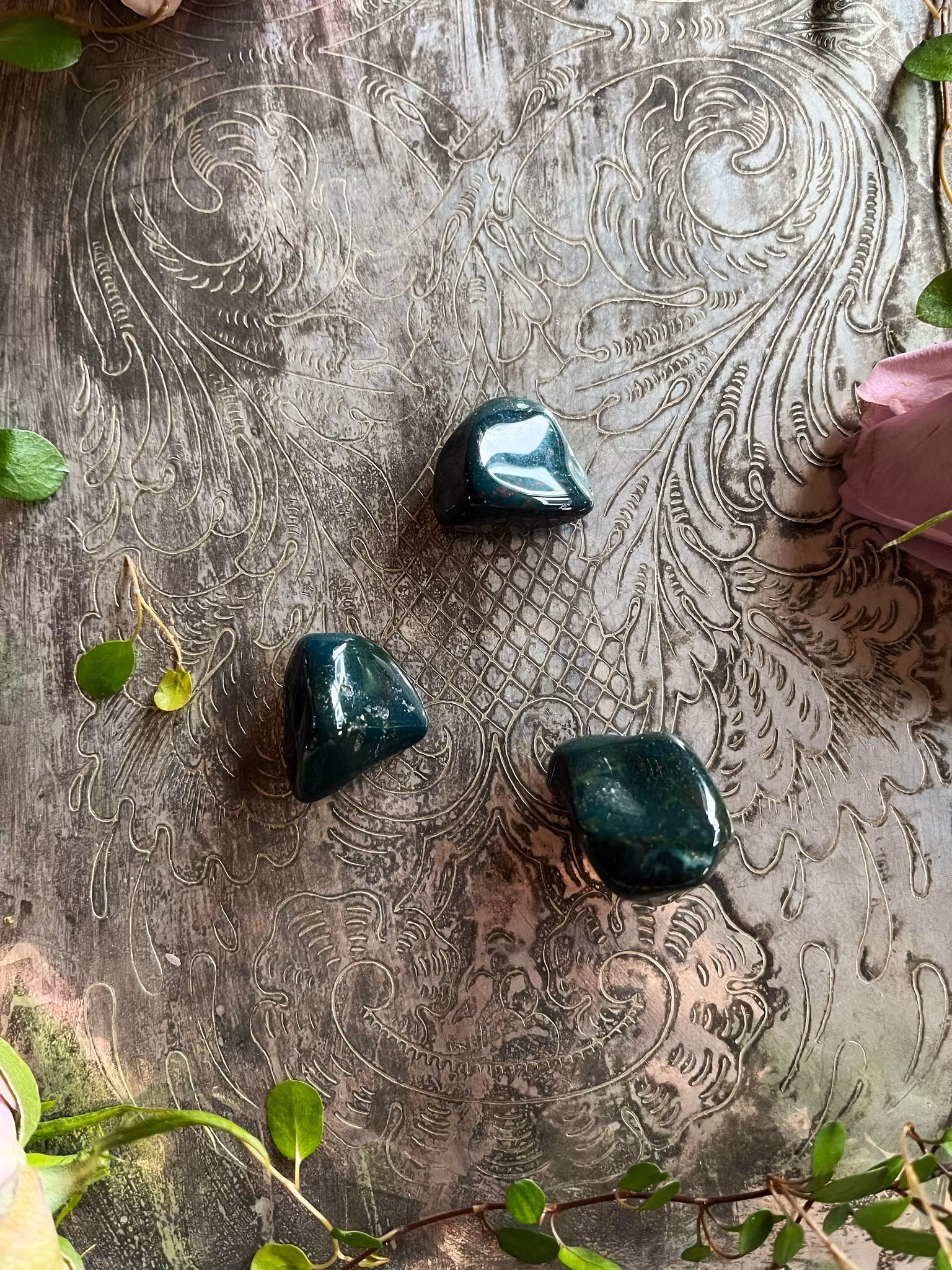 Heliotrop är en blodsten, den äkta, de röda prickarna som finns där är röd jaspis. Den är en kraftfull healing sten och har använts i tusentals år för dess healing krafter. Den används ofta för att avgifta och rena kroppen. Heliotrop för in kärlek och förståelse i alla situationer.