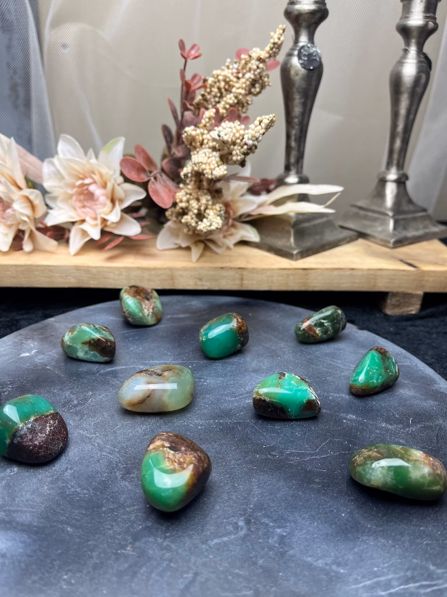 •Användning: Bär eller placera Krysopras när du behöver känslomässig läkning eller för att stärka din förmåga att ge och ta emot kärlek. Den är också bra för meditation, då den öppnar upp för en djupare kontakt med ditt hjärta och hjälper till att släppa blockeringar som hämmar din emotionella frihet. Krysopras kan även användas för att stärka och balansera hjärtchakrat.