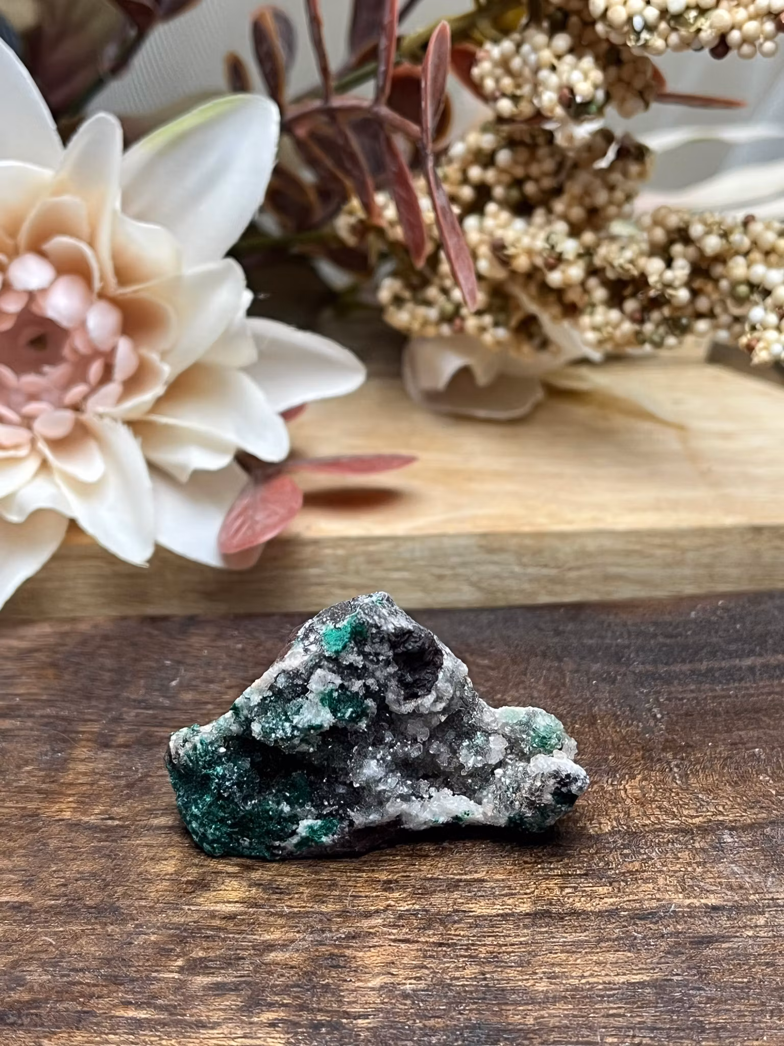 •Egenskaper: Malakit Kristallin är en kraftfull och transformerande sten som bär på intensiva energier för healing och skydd. Den kristallina formen av Malakit är särskilt effektiv för att stimulera djupgående emotionell och mental läkning. Malakit är känd för att absorbera negativa energier och strålar av renande energi, vilket gör den till en utmärkt sten för att skydda mot negativa influenser och främja positiv förändring. Dess intensiva gröna färg är starkt kopplad till hjärtchakrat, och den hjälper till att bearbeta och släppa blockeringar som kan hindra kärlek och inre harmoni.