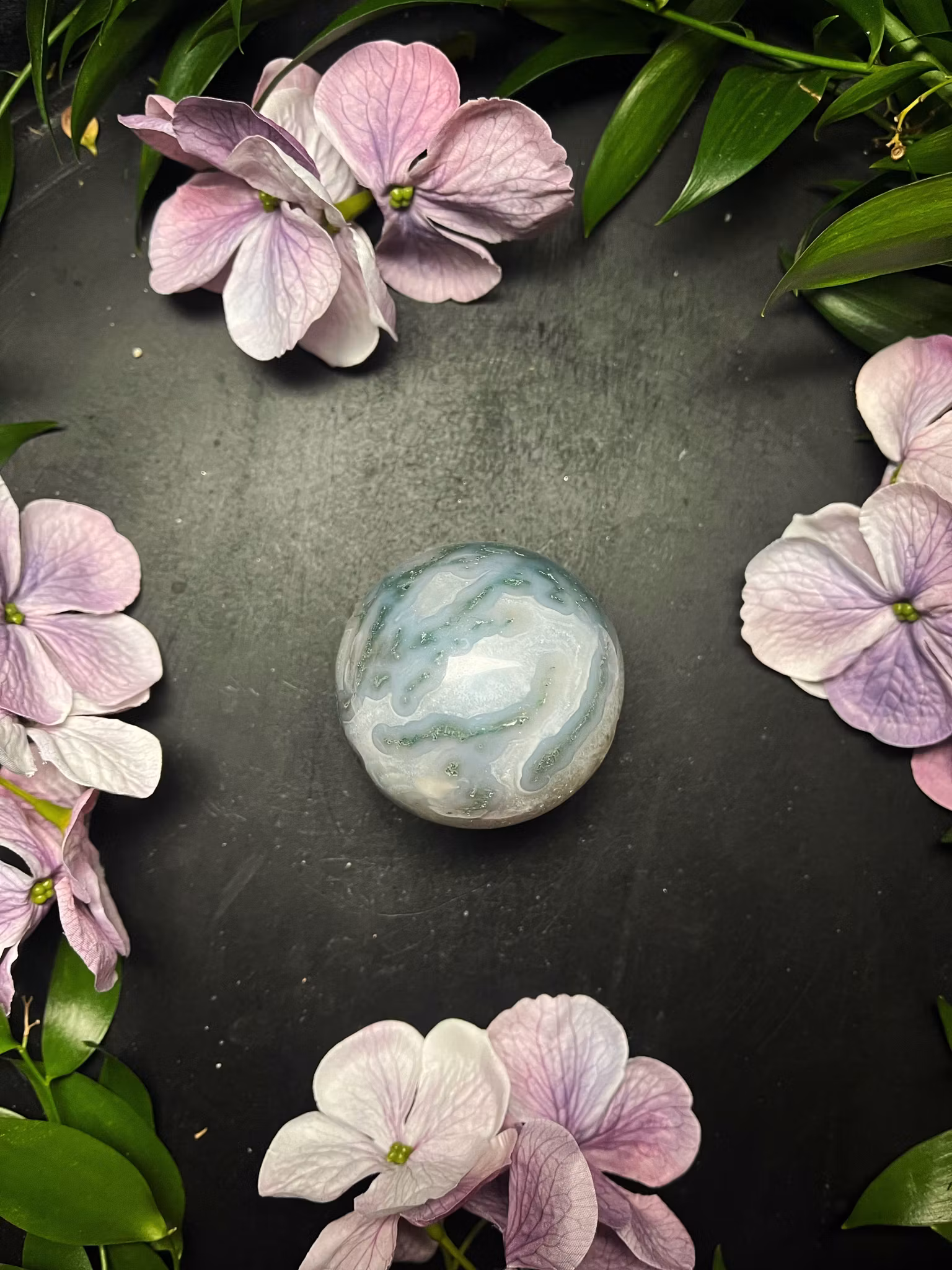 Moss Agat grundar, balanserar och stabiliserar. Ökar överflöd och stimulerar kreativiteten. En mycket andlig sten, lugnar sinnet och hjälper dig tänka klart.