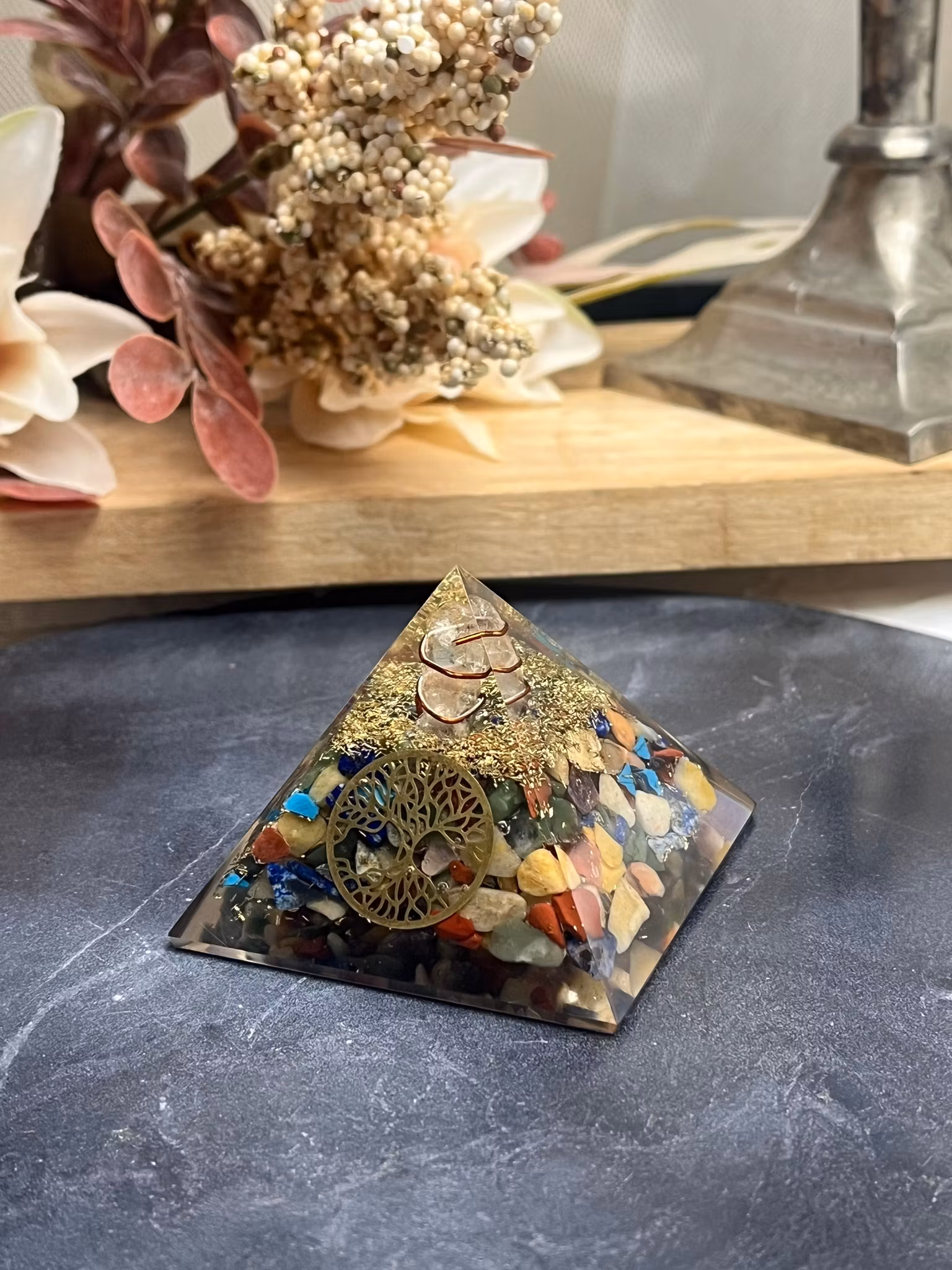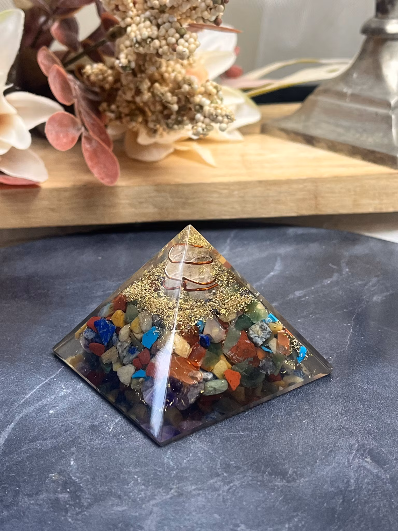 Vacker orgonitpyramid med Chakra kristaller och en kraftgenerator längst upp. Orgonit är en blandning av kristall, harts och metall. Pyramiden sägs balansera energierna i sin närhet och ha en avslappnande effekt som främjar fysisk och andlig hälsa. Bredd: 6 cm.