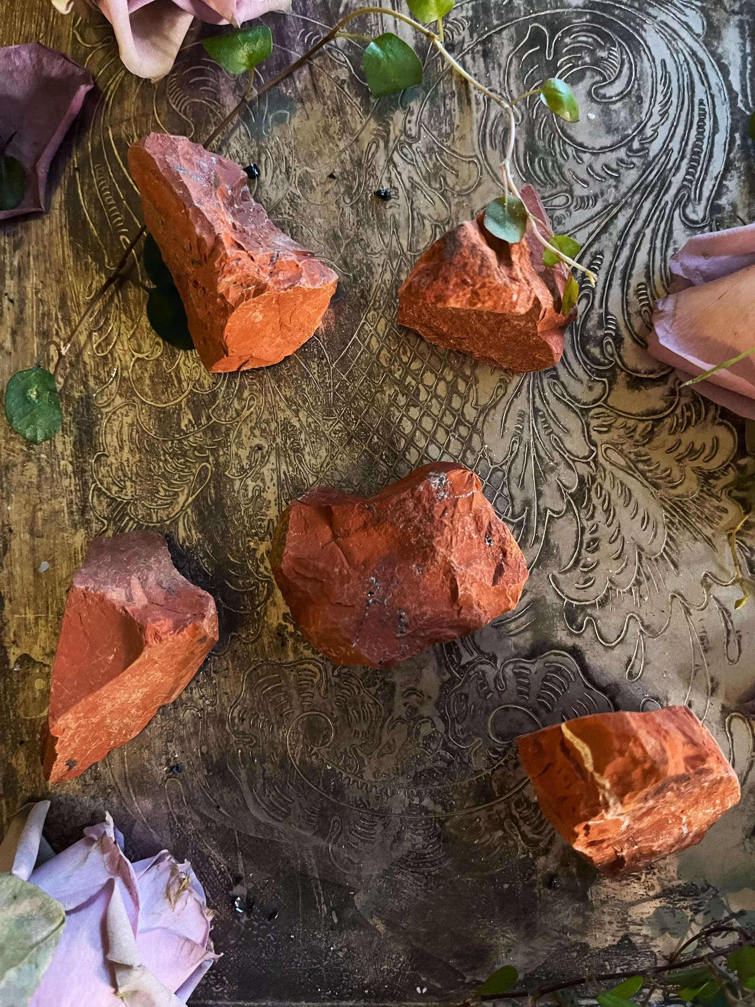 Röd Jaspis kan med fördel användas för att lugna eller stimulera bas chakrat. Indianerna anser att Röd Jaspis vara en helig sten. Den är full av grundande energi, och vibrerar av jorden energier.