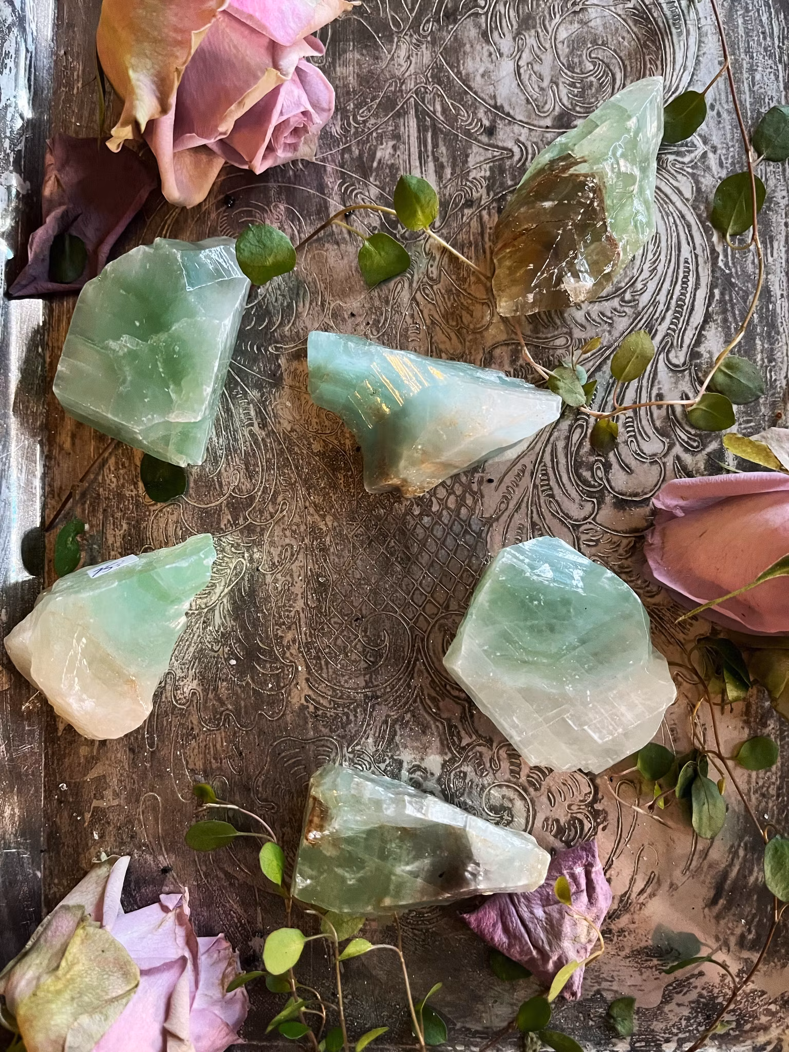 Grön Kalcit har en stärkande energi samtidigt som den är lenande för hjärtchakrat. Den fyller ditt hjärta med villkorslös kärlek. Balanserande, härlig att använda vid oro och stress stärker ditt minne och är en härlig sten att ha som följeslagare. En bra sten att ha vid förändringsarbeten, en riktigt tur sten.