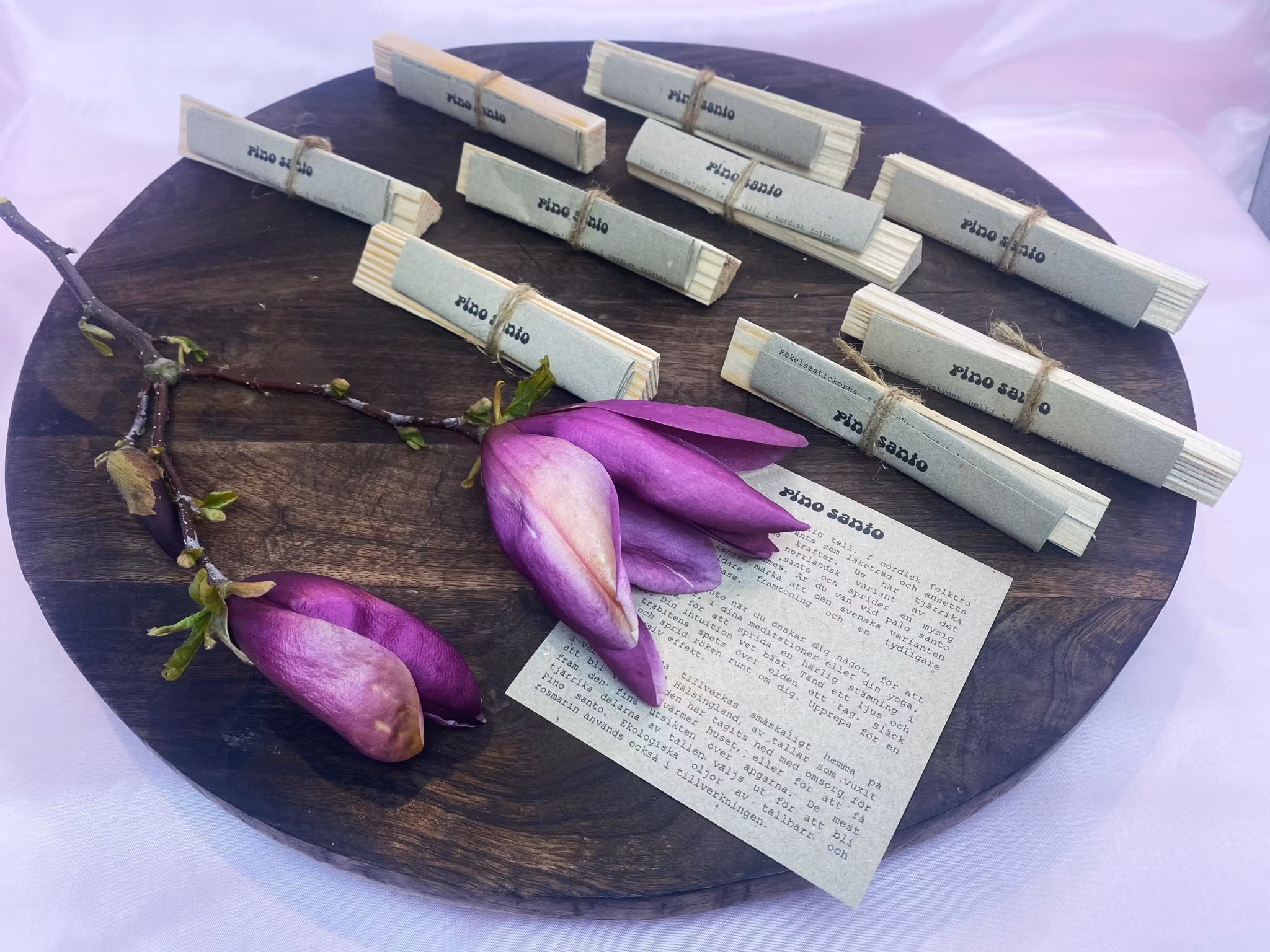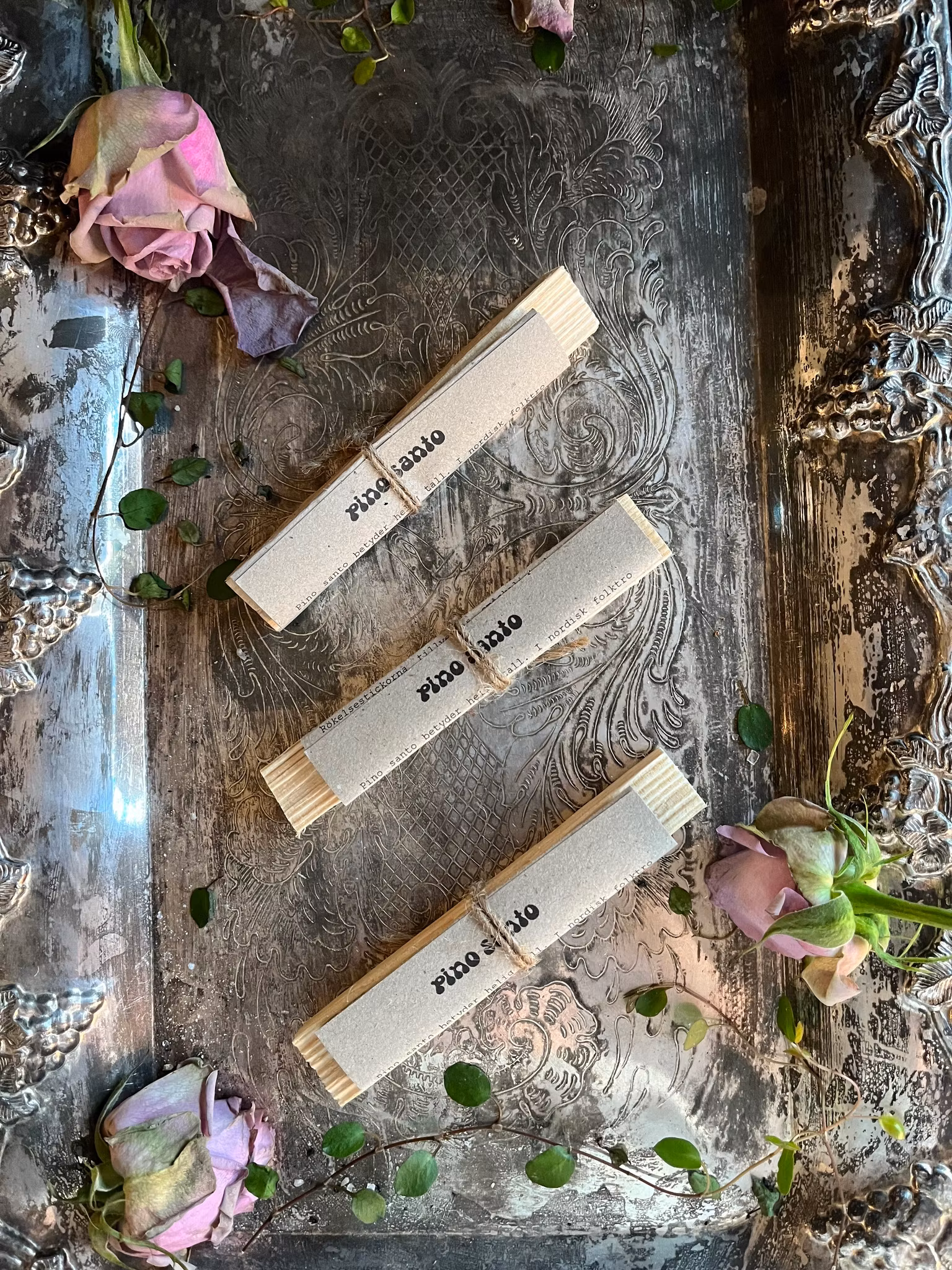 Pino Santo betyder helig tall. I nordisk folktro har tallen länge använts som läketräd och ansetts ha olika magiska krafter. De tjärrika stickorna är en norrländsk variant av den sydamerikanska Palo Santo och sprider en mysig doft av skog i rummet. Är du van vid Palo Santo kommer du kanske märka att den svenska varianten har en mildare framtoning och en tydligare karaktär av brasa.