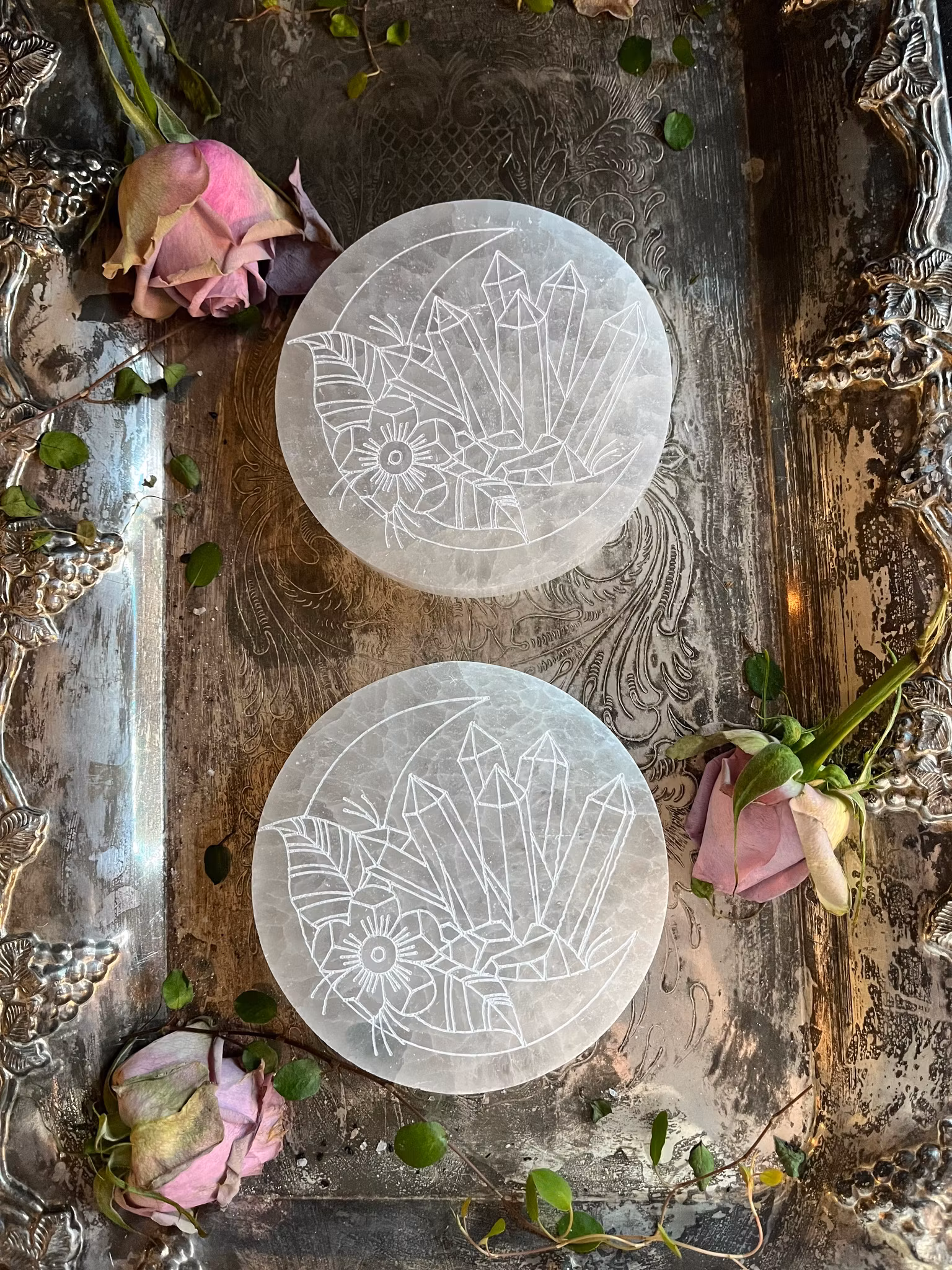 Vackra runda vita Selenitplattor med vackert mönster. . Fina att ha t.ex. smycken på samt perfekt laddningsplatta för dina kristaller. De skiftar något i utseende. Vikt ca. 300gram. Mått ca. 8.5x8.5 cm, tjocklek varierar. Du köper slumpvis liknande kristall enligt text & bild ovan. Tänk på att kristaller kommer från naturen & naturliga sprickor & ojämheter kan förekomma. Färger kan skilja sig beroende på ljuset samt även mellan olika bildskärmar m.m.