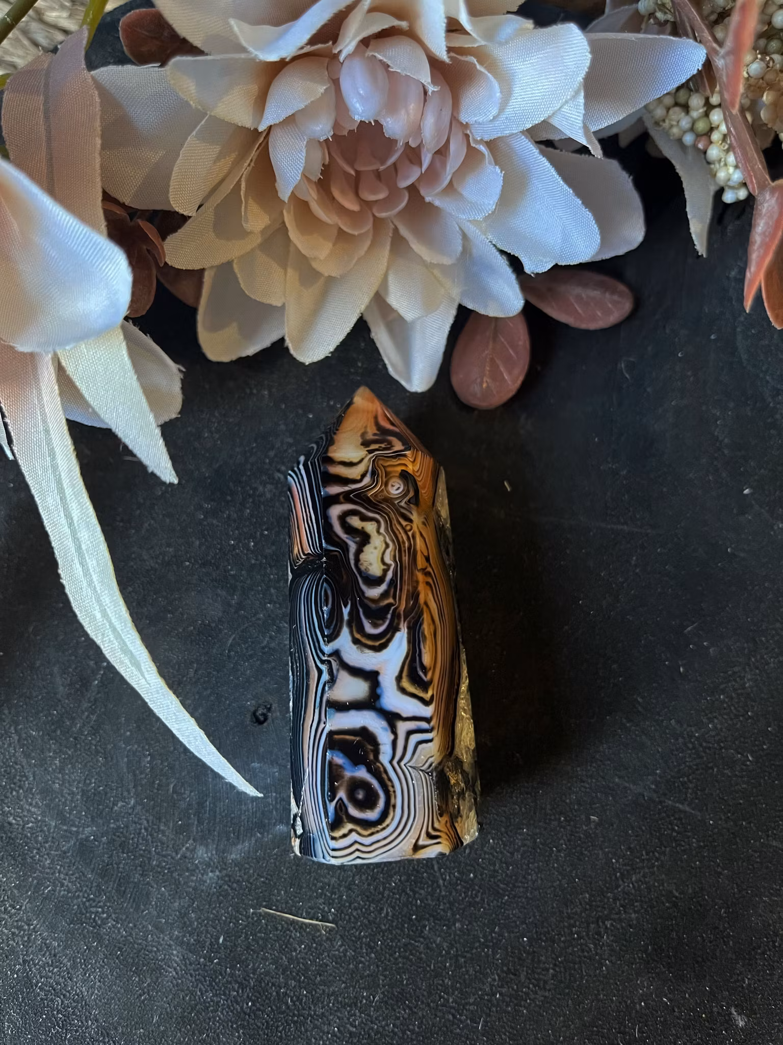 •Egenskaper: Silkesagat, även känd som silk agat, är en lugnande och mjuk kristall som främjar inre frid, stabilitet och emotionell balans. Dess subtila, silkeslika mönster ger en känsla av lugn och harmoni. Kristallen hjälper till att lindra oro, främjar självacceptans och skapar en känsla av trygghet. Den sägs också stärka din kontakt med jordens energi och stödja en djupare koppling till ditt inre jag.