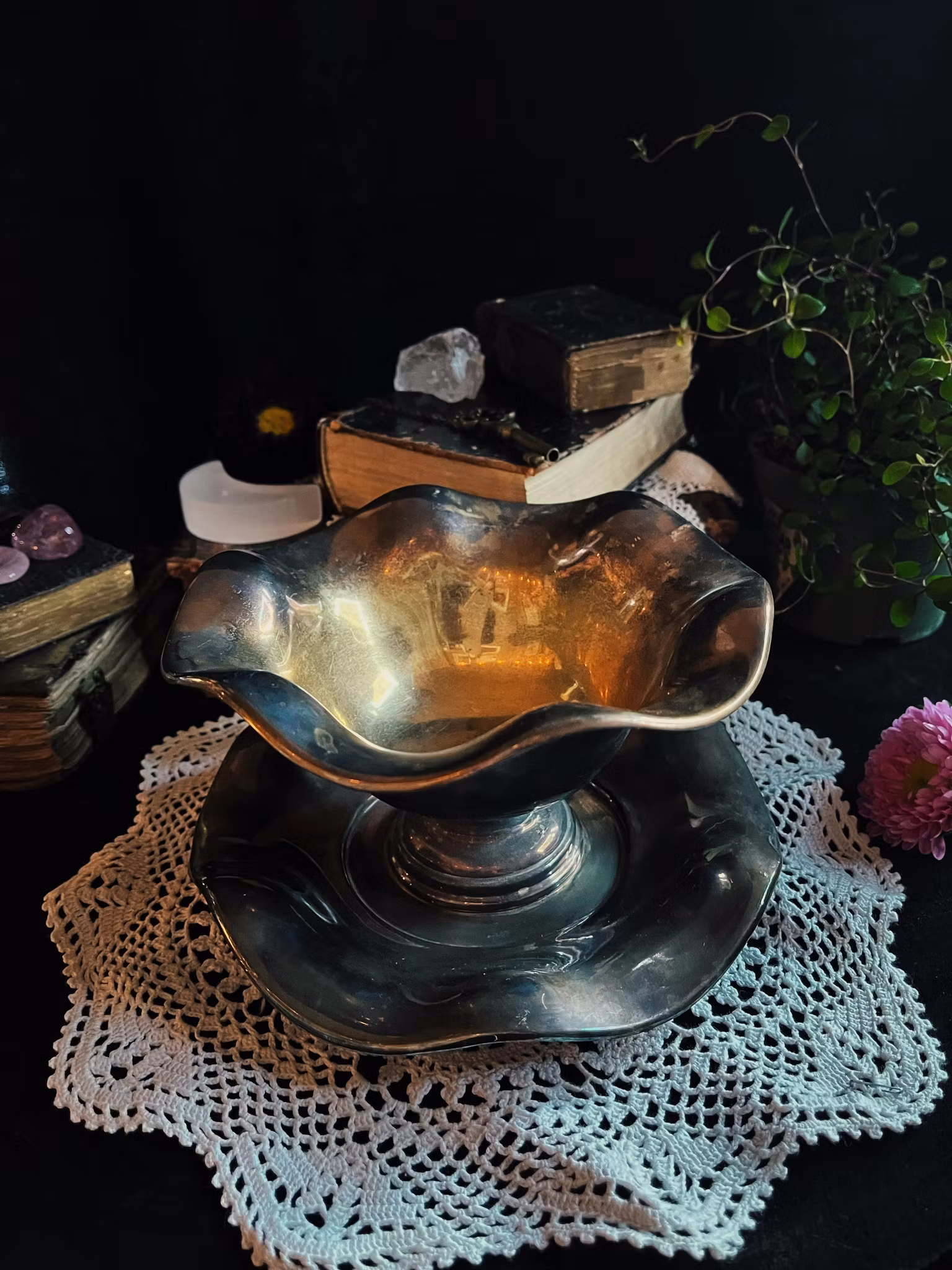Super fint fat i mässing att lägga torkade blommor, kristaller eller ljus på. Riktigt fin som dekoration till ditt altare.