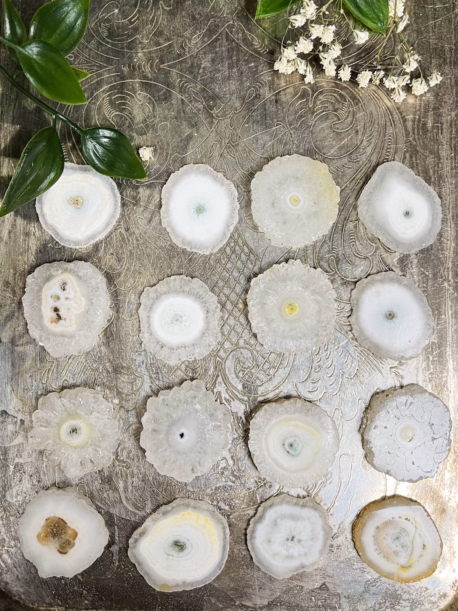 Solar Quartz kallas agatiserad kvarts som kommer från stalaktiter i transparent, vitt eller grått, med mosslika inneslutningar. Stalaktiterna delas sen i skivor som blir dessa fantastiska solliknande kristaller.