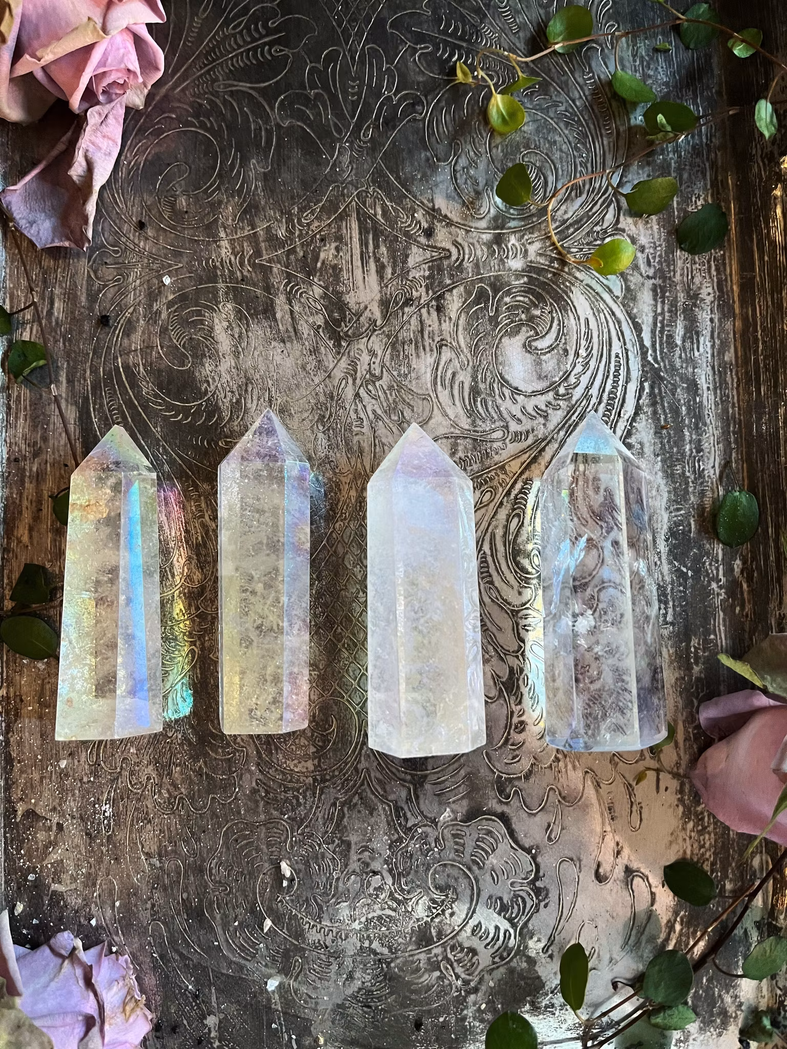 Angel Aura kvarts har doppats i platina och bismuth och sedan behandlats i tryckkammare för att anta sin änglalika färg. Renande på auran och underlättar kontakten med dina änglar och guider. Tar bort negativitet och skyddar dig mot energitjuvar och energiattacker.