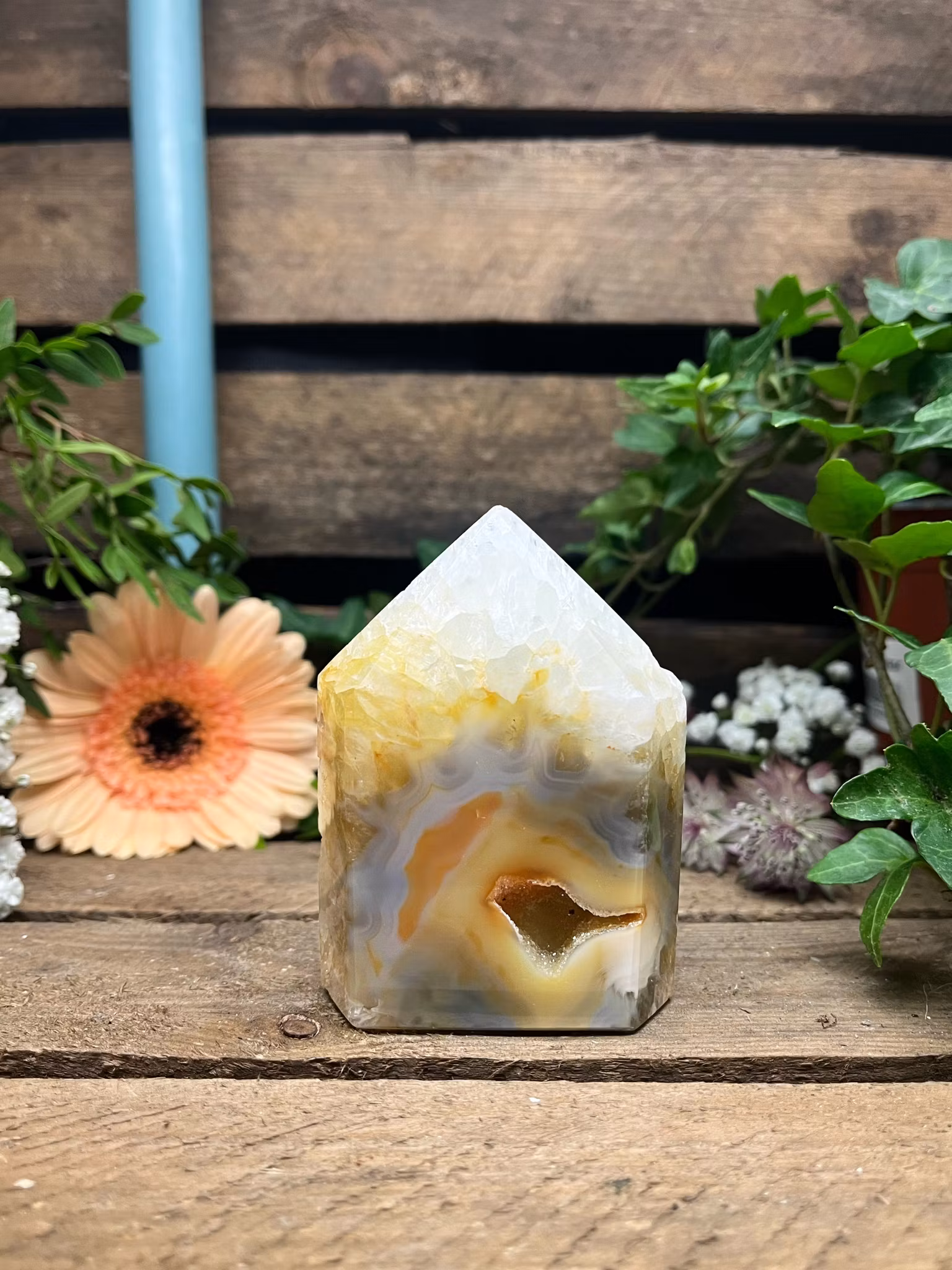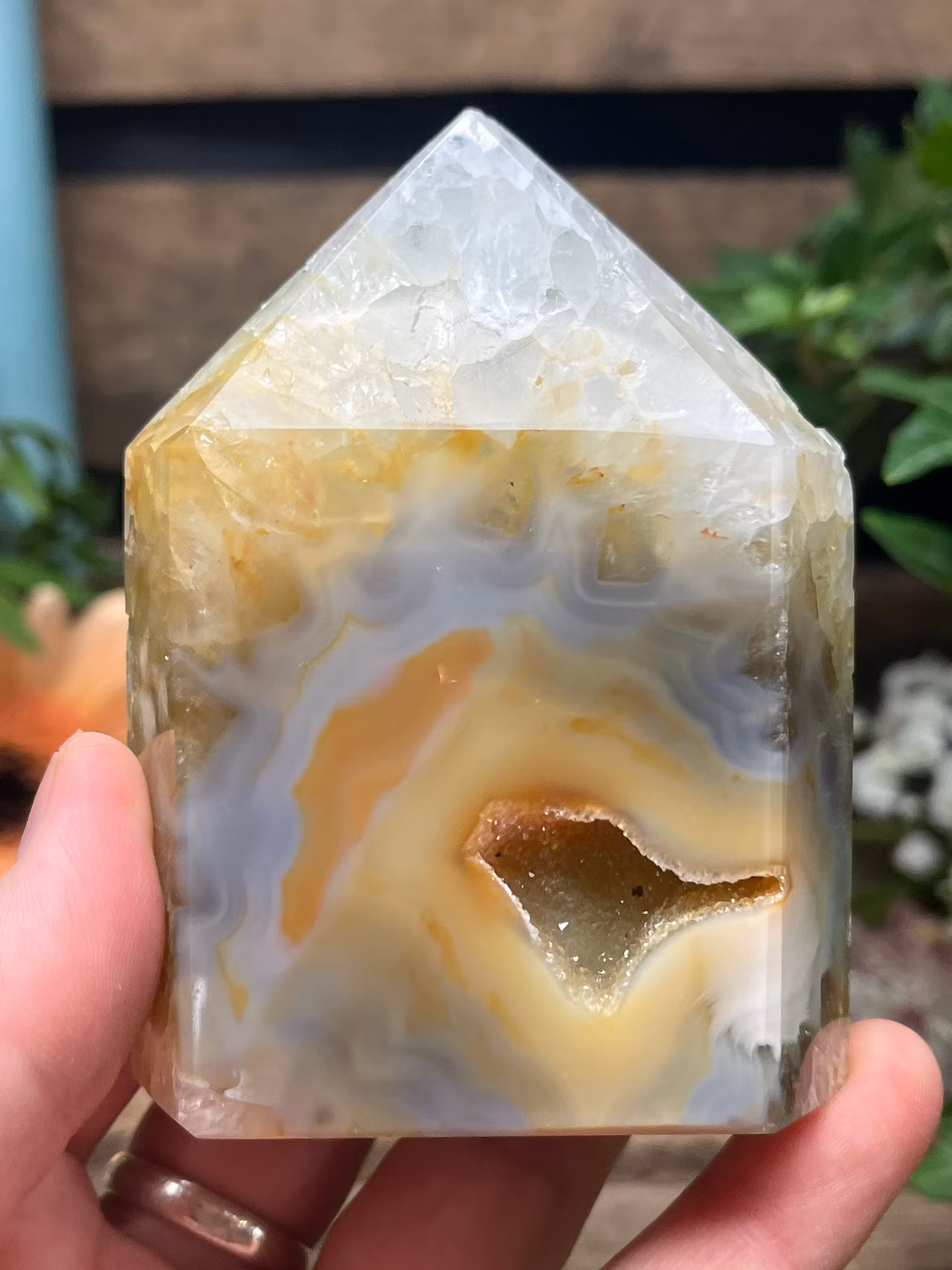 Druze Agat är en typ av läkande sten som har "druzy" över agatstenen. Druzy Agate är en sten som förknippas med kärlek, frid, stresslindring, intuition och förstärkning av anden. Detta ger stenen ett iögonfallande glitter och glans.