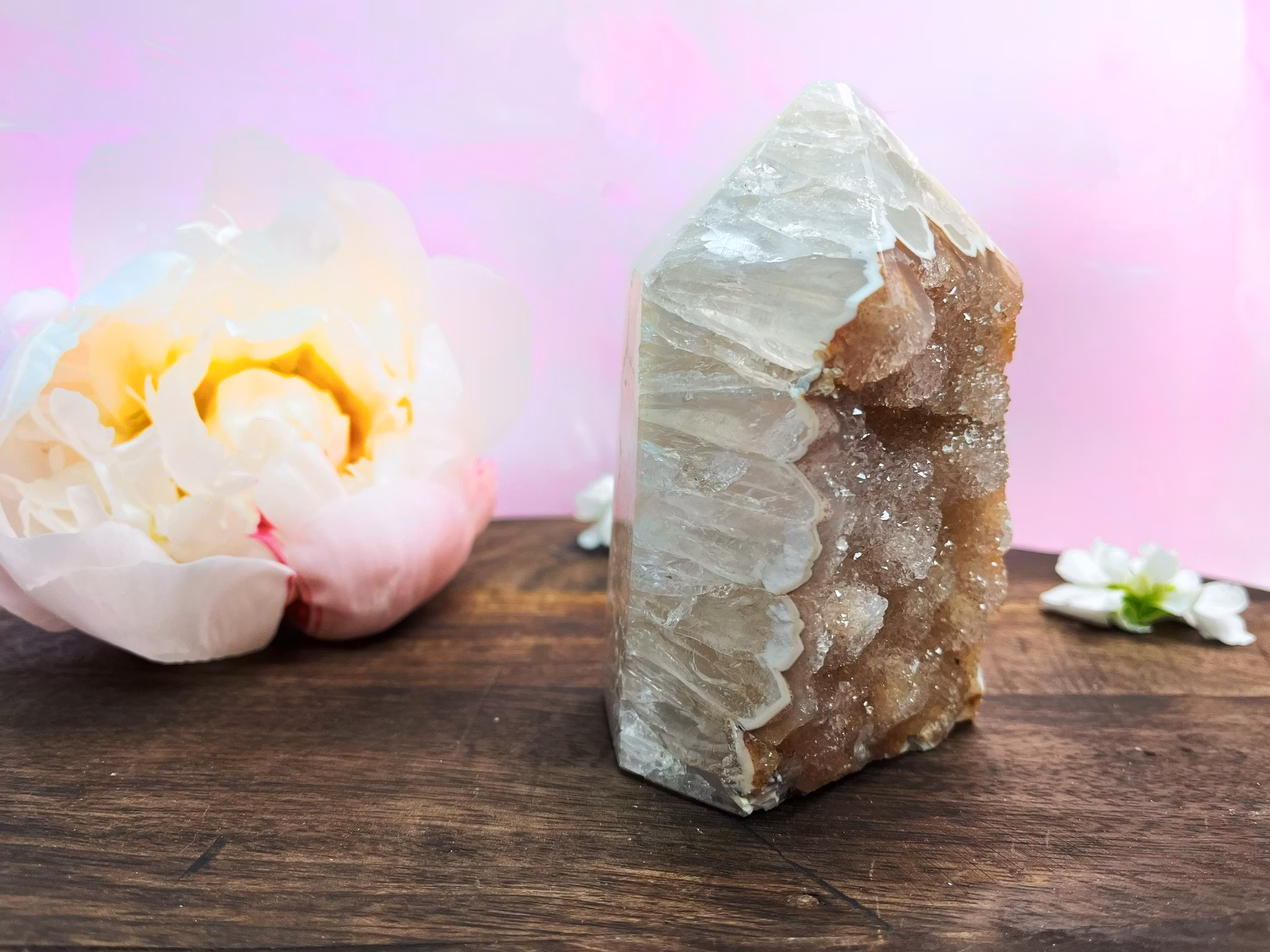Druze Agat är en typ av läkande sten som har "druzy" över agatstenen. Druzy Agate är en sten som förknippas med kärlek, frid, stresslindring, intuition och förstärkning av anden. Detta ger stenen ett iögonfallande glitter och glans.