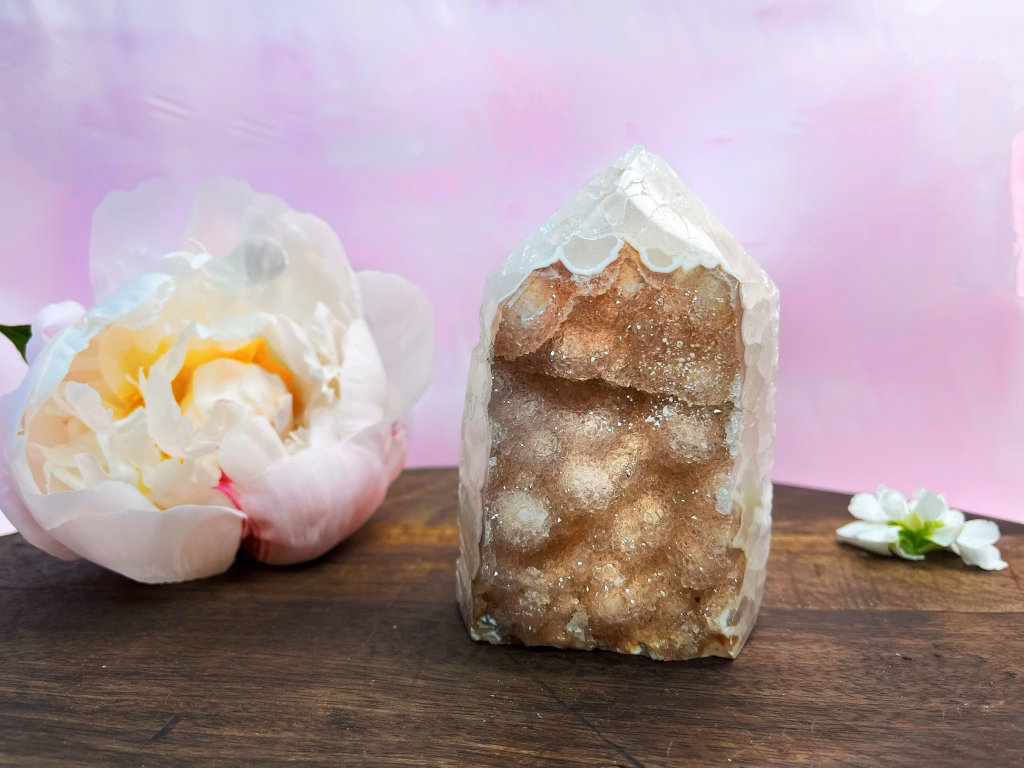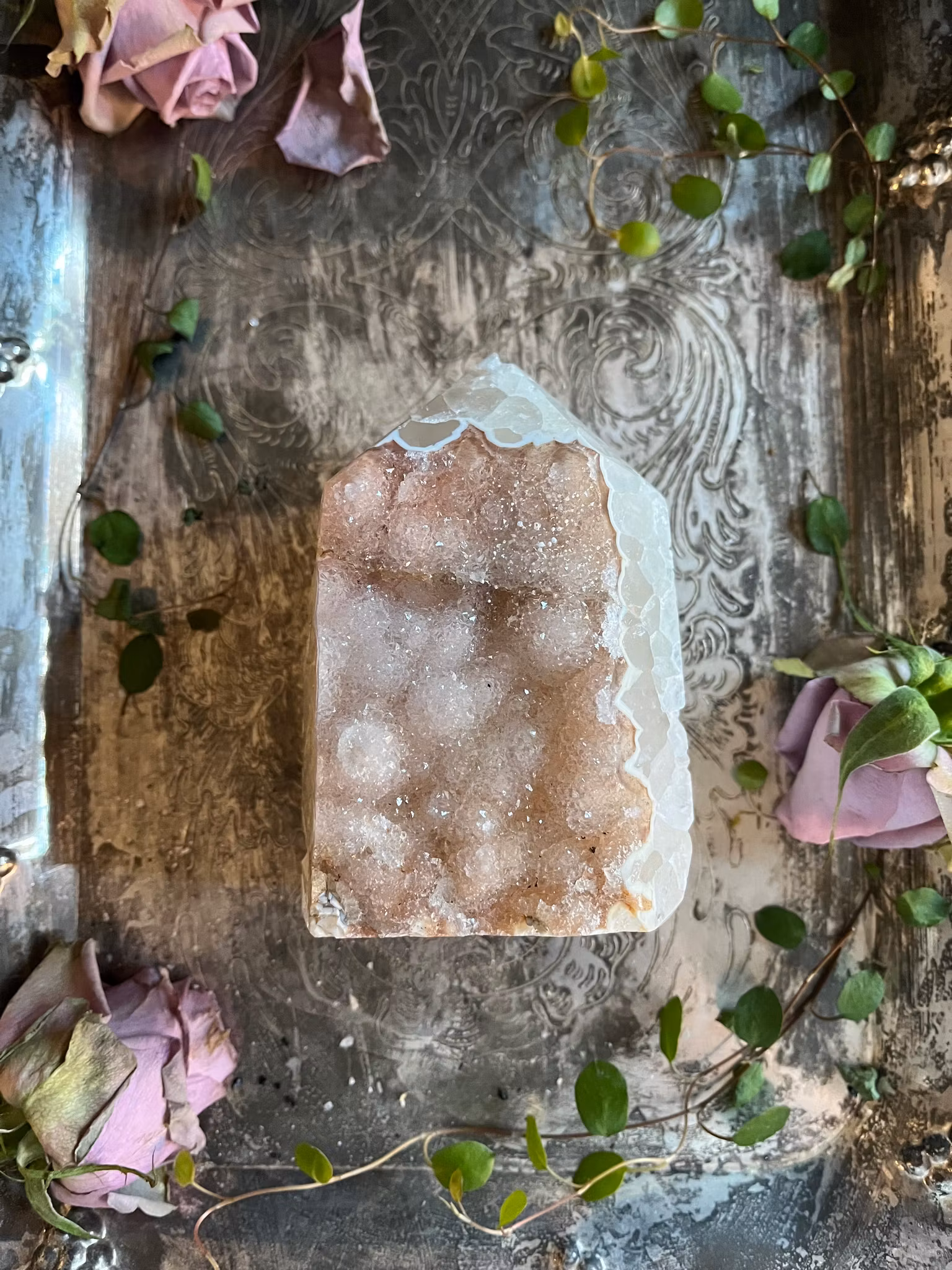 Termen "Druzy" hänvisas till den lilla, glittrande kristallstrukturen som bildas på värdstenens yta. En druzy sten är riktigt bra för sin förmåga att lindra stress, få lugn och stärka immunförsvaret i vår kropp. Det främjar ett hälsosamt känslomässigt band och fysisk styrka med oss.