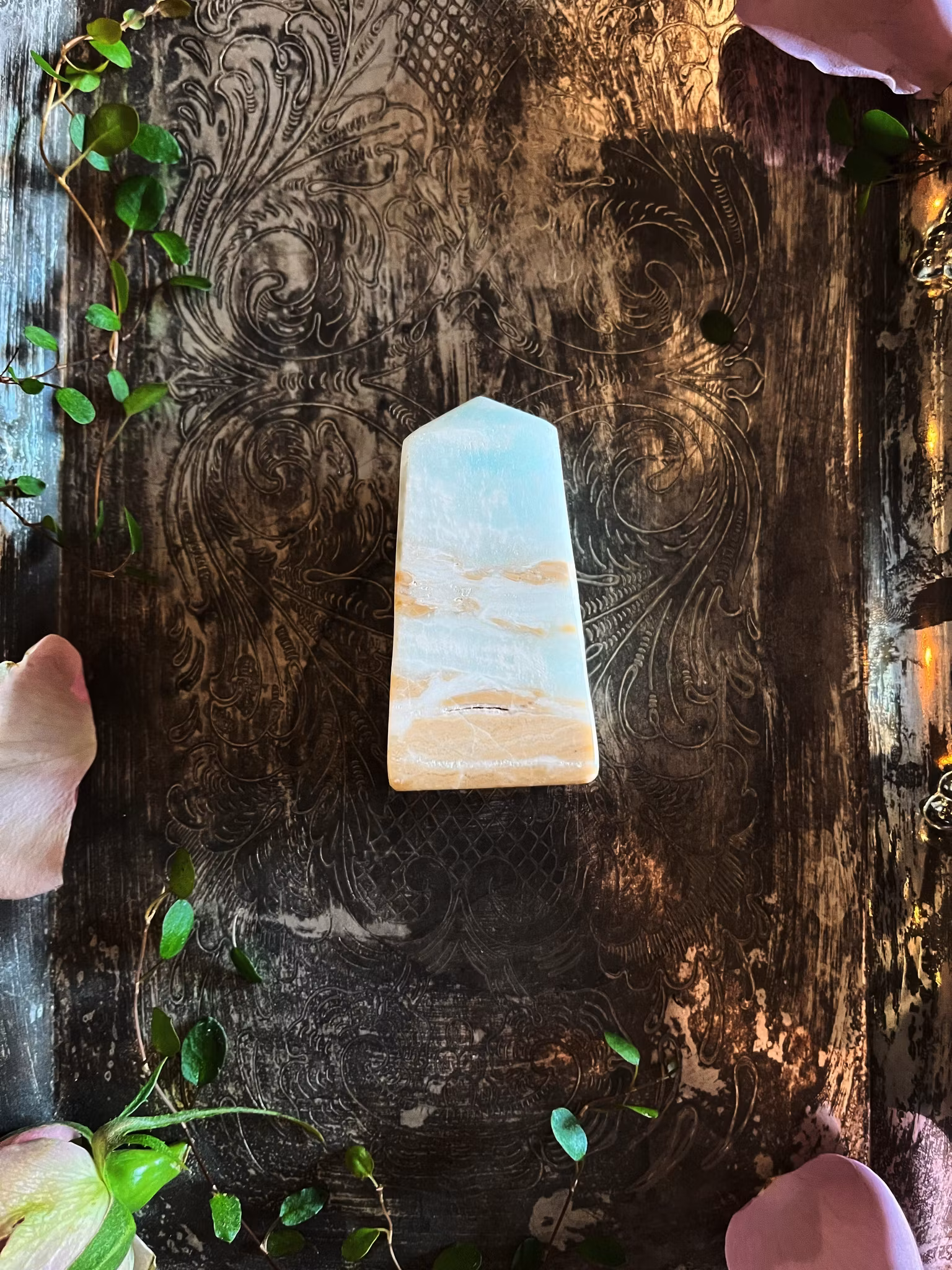 Karibisk blå Aragonit är en ganska ny sten som hittats i Pakistan, den är en blandning av olika Aragoniter. Den har en lugnande energi, som lättar sinnet och är mycket bra att använda vid tex. meditation. Hjälper dig att tänka i nya banor speciellt när du kört fast. Den tar bort negativa känslor och energier och omvandlar dem till positiv energi