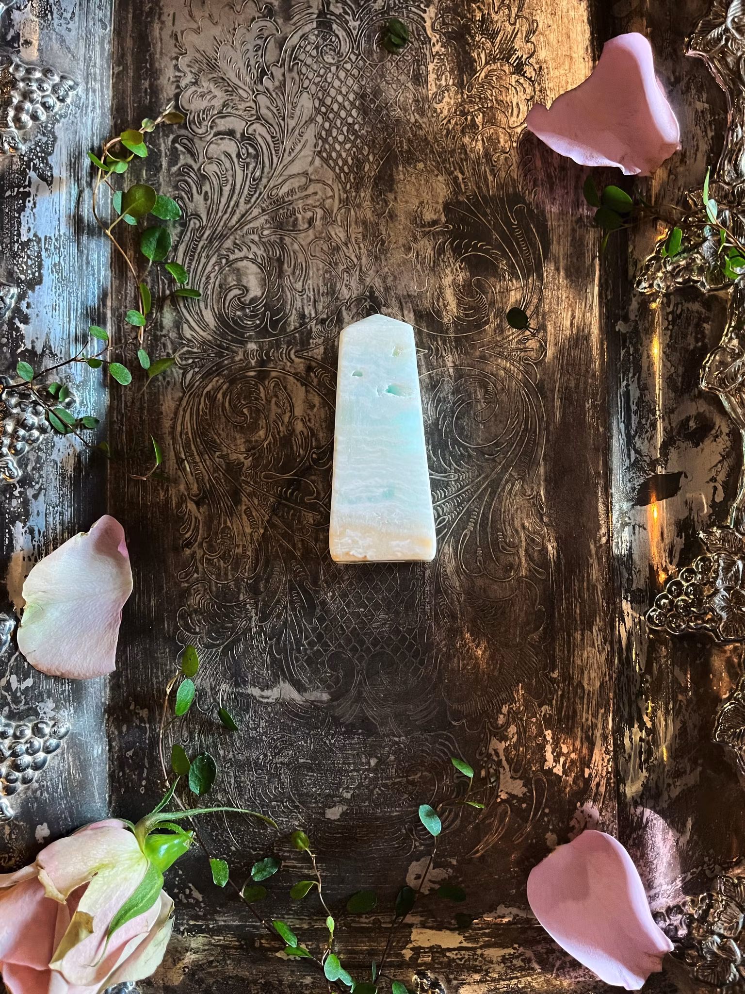 Karibisk blå Aragonit är en ganska ny sten som hittats i Pakistan, den är en blandning av olika Aragoniter. Den har en lugnande energi, som lättar sinnet och är mycket bra att använda vid tex. meditation. Hjälper dig att tänka i nya banor speciellt när du kört fast. Den tar bort negativa känslor och energier och omvandlar dem till positiv energi