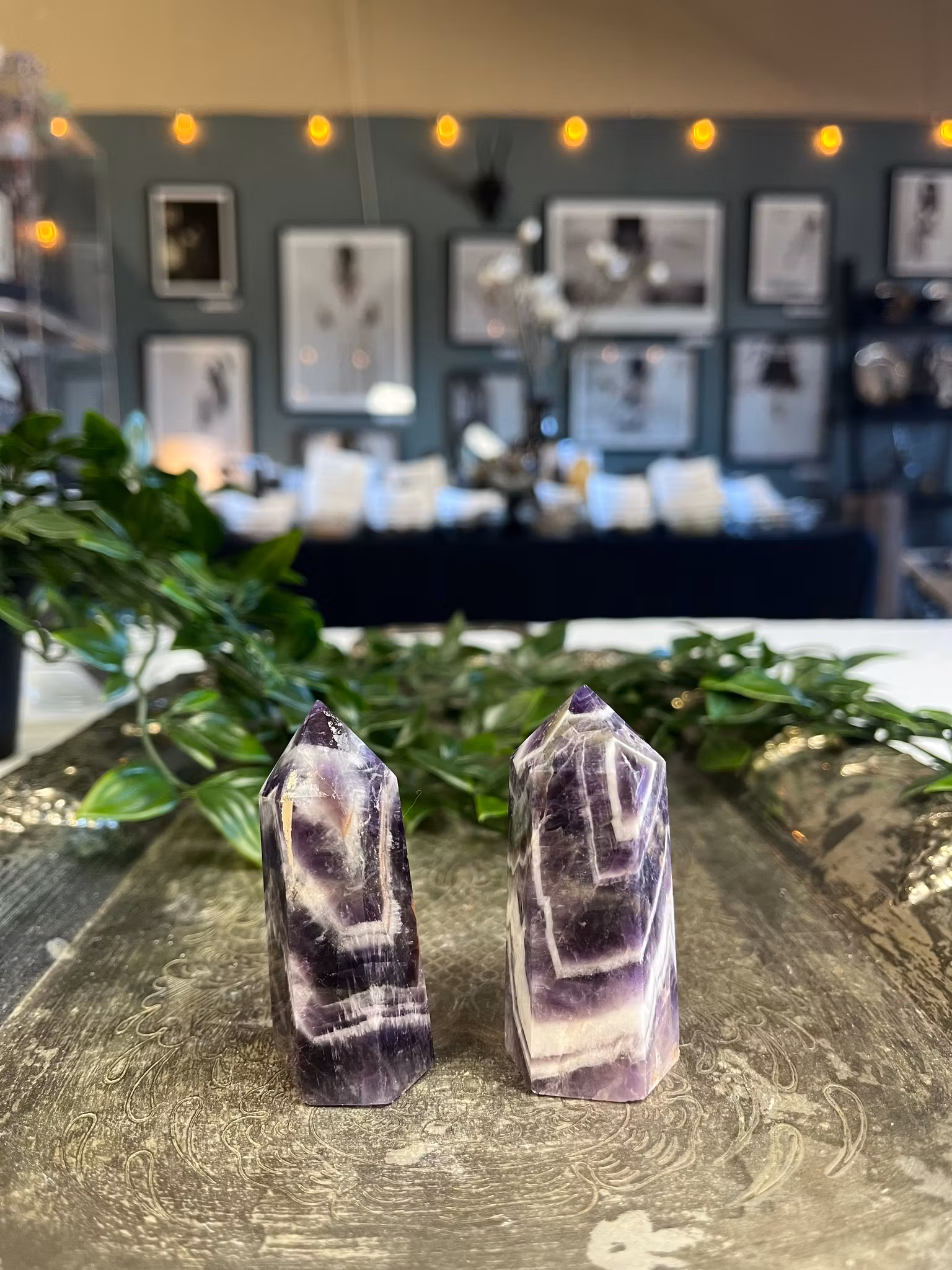 Band Ametist är en blandning av Ametist och vit kvarts, blandade tillsammans. Den kallas även Chevron beroende på hur mönstret ser ut i stenen. Ger styrka, stressbefriande en mycket andlig sten.
