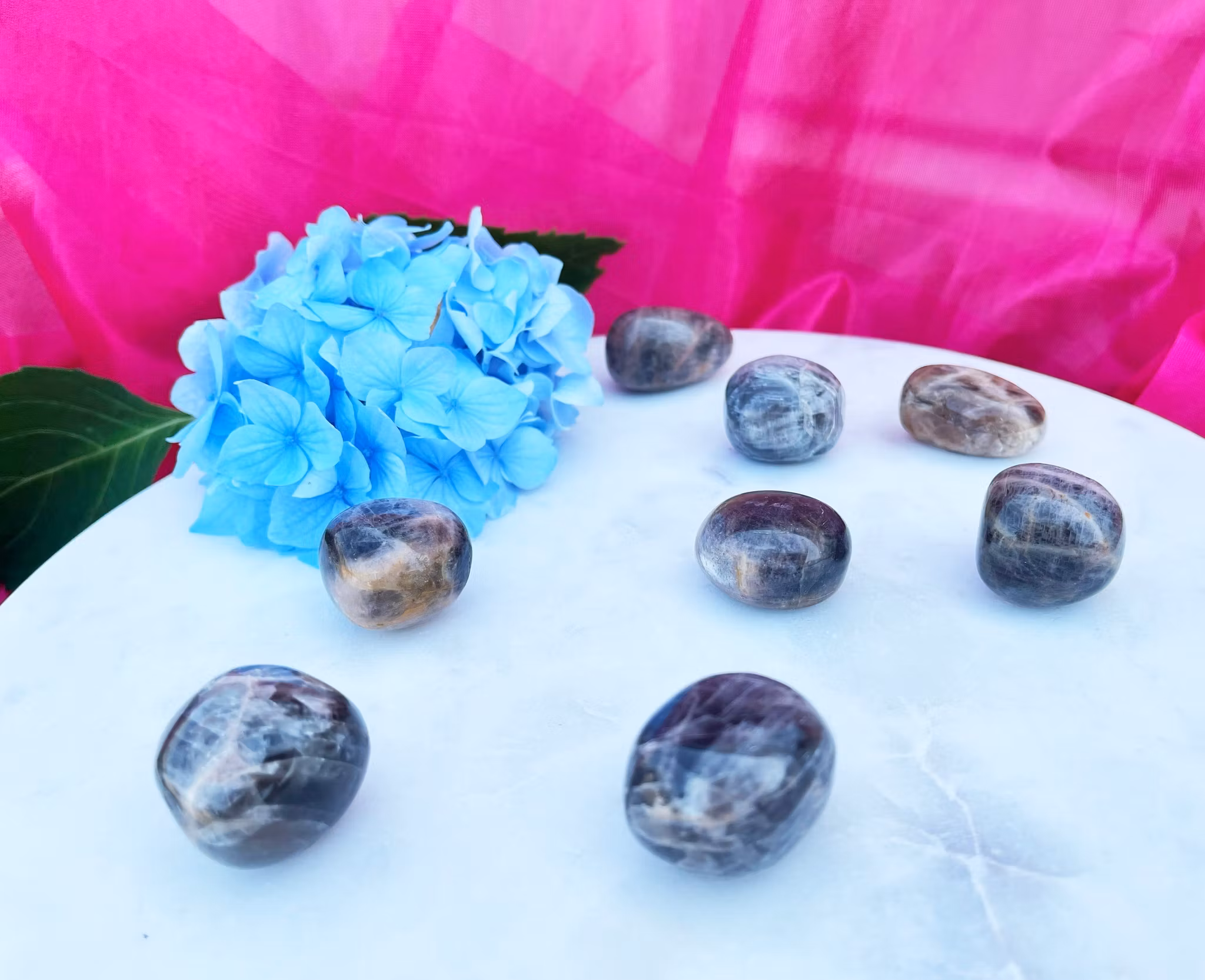 Svart Månsten har en kraftfull energi, som hjälper dig få kontakt med din gudomlighet under meditation. Hjälper dig öka din energi, samtidigt som den grundar dig. Den har starkt kvinnliga energier, och har även samma egenskaper som den vita månstenen.