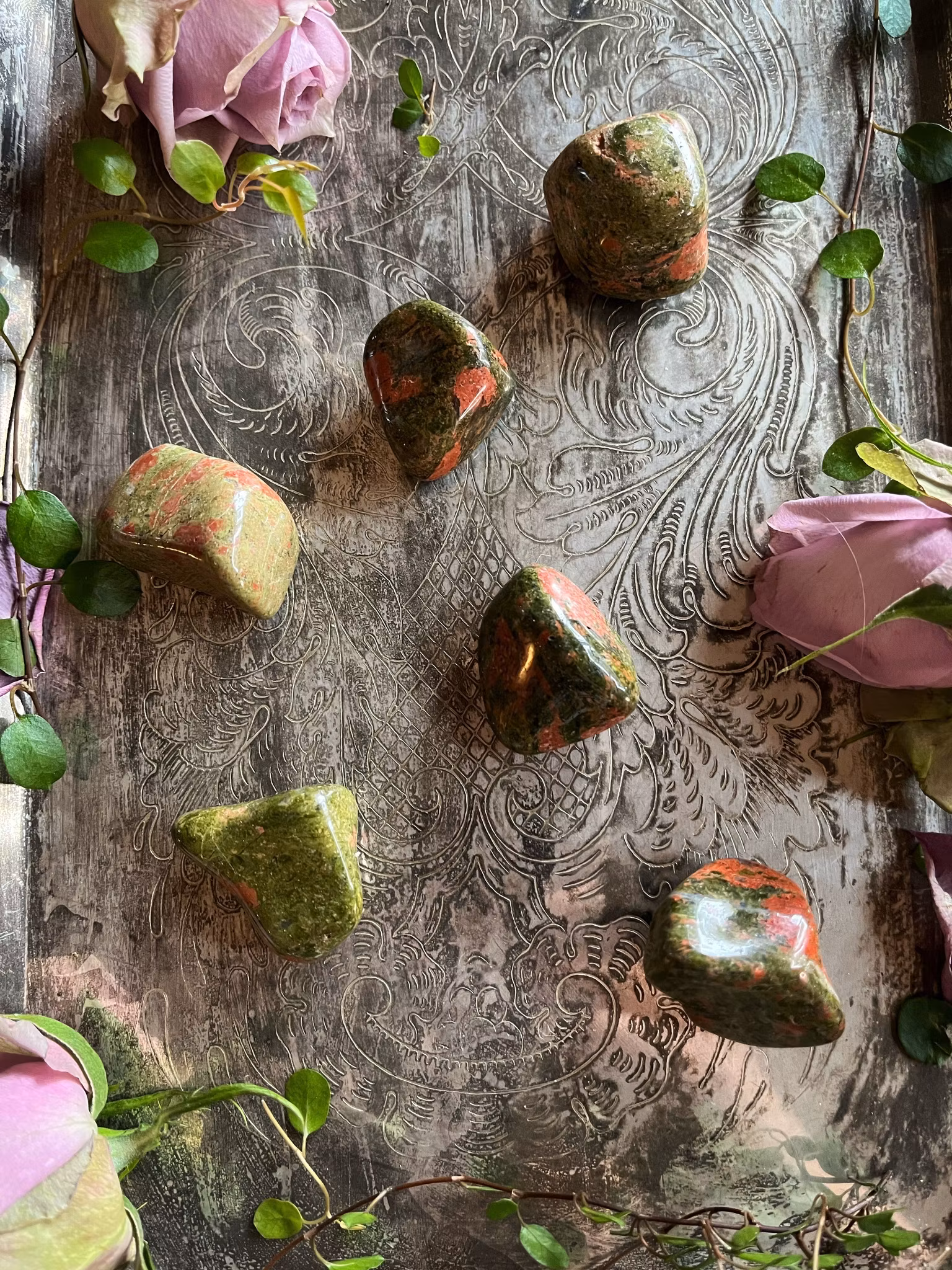 Unakit är en sten för visioner den kan öppna och aktivera ditt tredje ögas chakra för att ta emot andliga insikter från de högre frekvenserna. Unakit's grundande effekt för med sig en lugnande känsla till alla omgivningar, den sänder ut rogivande vibrationer till alla omkring den.