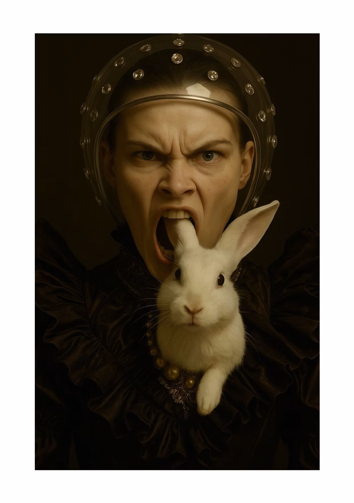 The Keeper captures a raw moment of defiance and guardianship, a surreal confrontation between fragility and fury. The woman’s face is twisted in a snarl of protective rage, her expression unyielding, eyes blazing with intensity. Emerging from her mouth, a pristine white rabbit sits with a serene calmness, as if untouched by the chaos surrounding it. Its fur, impossibly white against the dark fabric and pearl-studded armor, symbolizes purity and vulnerability—a paradox to the woman’s fierce demeanor.