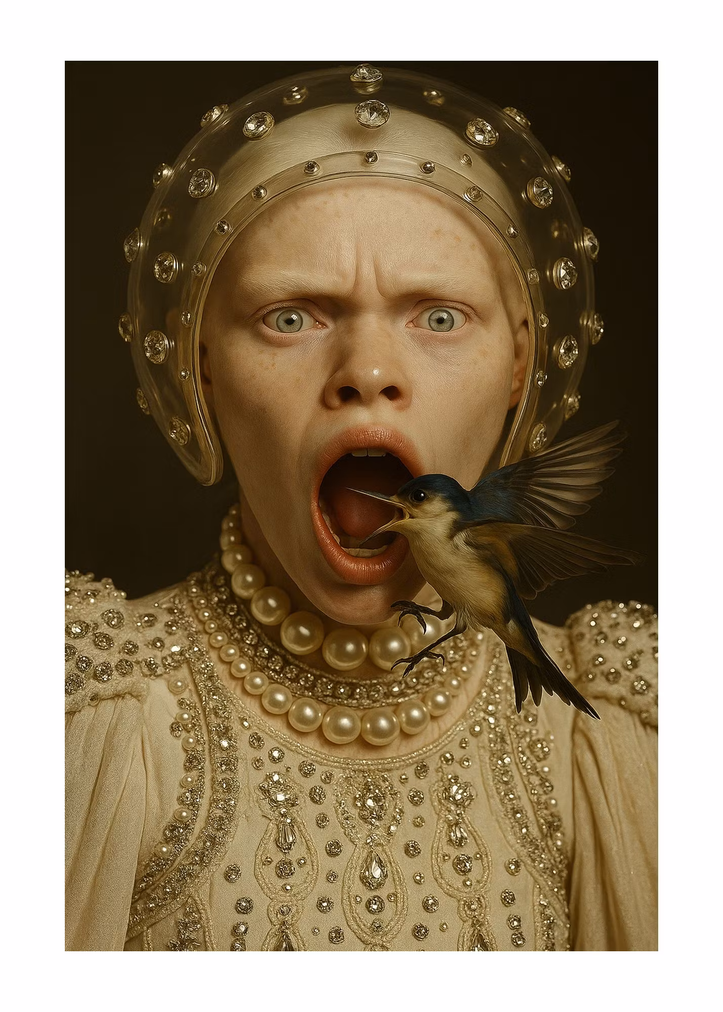 The Omen is a revelation captured in a frozen moment—a whisper of fate emerging from the depths of silence. Her gaze, wide and unyielding, reflects the fragility and power of prophecy. From her parted lips, a delicate blue bird takes flight, its wings mid-beat, frozen in the act of escaping her mouth.